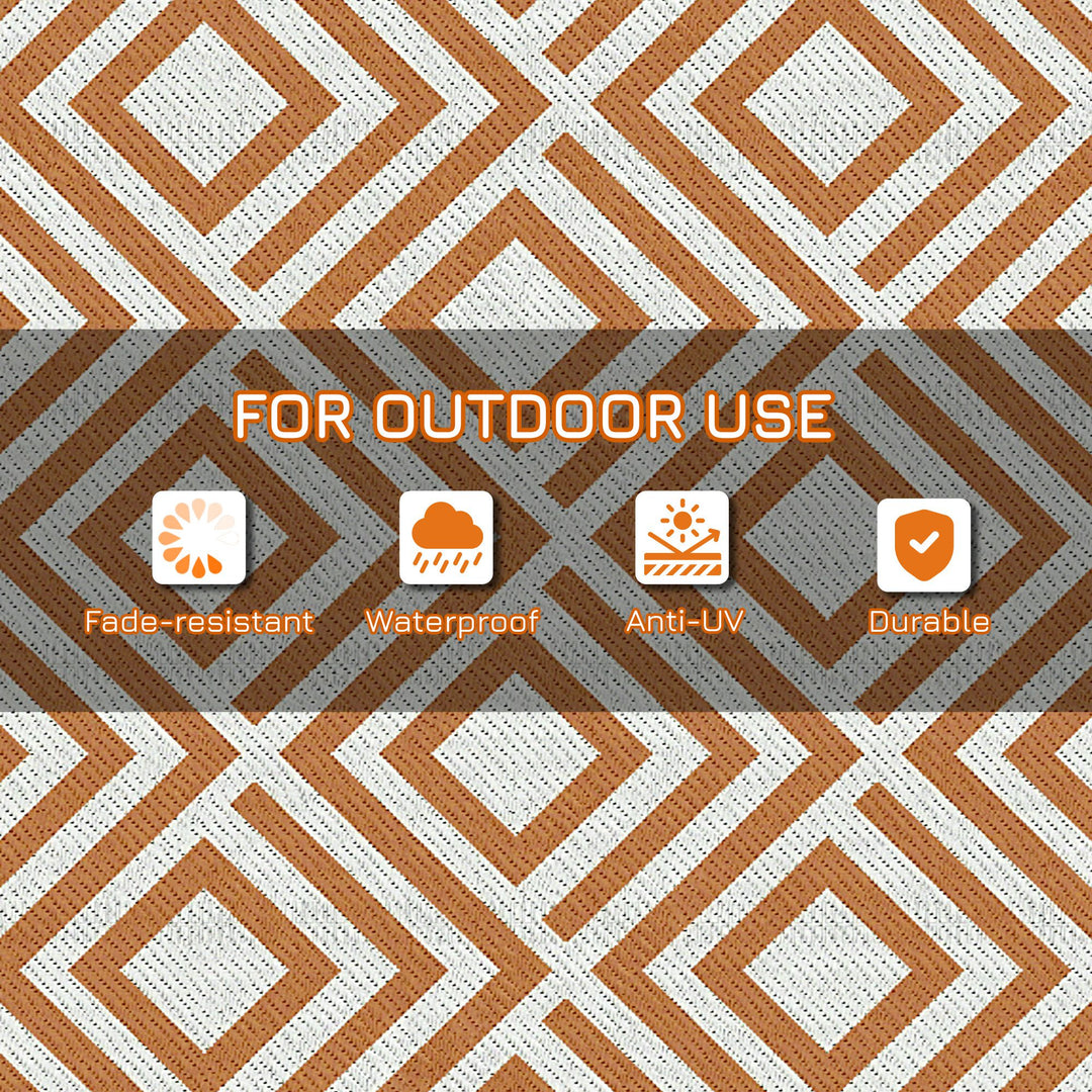 The Outsunny waterproof outdoor rug is great for using where you want outdoors. Whether it's for camping, picnics, festivals or your own garden, simply fold it and go. Durable and water-resistant material makes it suitable for outdoor use. Plus, the plastic outdoor rug is reversible, so you can double the use when one side gets dirty. Comes with carry bag to keep safe when travelling.