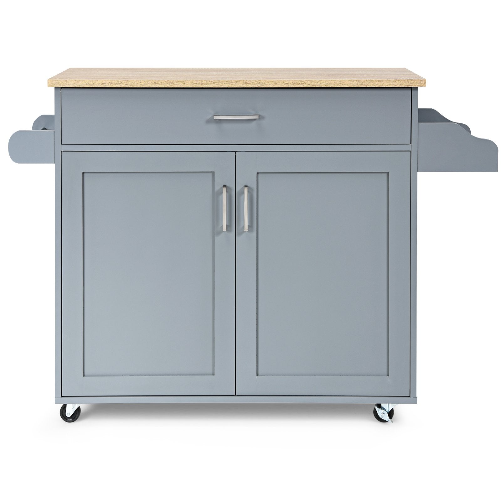 This kitchen island cart with storage is a perfect addition to your home! Equipped with a spacious countertop, a 2-door cabinet, a large drawer, a side towel rack and spice rack, this kitchen organizer cart provides ample storage space to keep your kitchenware and other items in good order. And the inner shelf can be adjusted to 3 positions, allowing you to store stuff in different sizes. Made of thick boards with exquisite surface treatment, this rolling buffet cabinet is stable and durable enough to serve you for a long time. 4 smooth-rolling wheels make the cart easy to move while the lockable design helps you to stop the cart in a specific place stably. This kitchen island cart can also work as a bar cart, dining storage cabinet, or even as a console table. With the modern style and simple design, this kitchen island on wheels can fit well with any home decor. Large Storage Space and Adjustable Shelf: Designed with a wide countertop, a 2-door cabinet, a large drawer, a towel rack and spice rack, this kitchen island cart provides abundant storage space for your kitchen appliances, fruits, vegetables, tableware, etc. Besides, the inner shelf can be adjusted to 3 positions to meet different needs. Stable Construction and Durable Material: This kitchen island on wheels is crafted from high quality MDF and engineered wood, making it sturdy and durable enough for long-lasting use. Besides, the surface with exquisite treatment is smooth, wear-resistant, waterproof and easy to clean with damp cloth. Modern Style and Multifunctional Design: With simple design and elegant appearance, this kitchen island cart can fit well with various home decoration styles and add modern charm to your living space. Crafted for versatility, this kitchen island cart can also serve as a buffet table in the dining room or a console table in your living room or hallway. Easy Movement and Lockable Wheels: This kitchen storage cart comes with 4 smooth universal casters, allowing you to push it to any place you want with ease. Besides, 2 of the casters are equipped with brakes so that the kitchen cart can stay firmly in position to avoid accidents caused by sudden movement. Thoughtful and Humanized Details: The large handles and magnetic catch provide great convenience and security to open and close the cabinet door. Equipped with superior slides, the drawer can be pulled out easily and smoothly. Moreover, the pushing handle on the island cart can be used as a convenient towel holder.