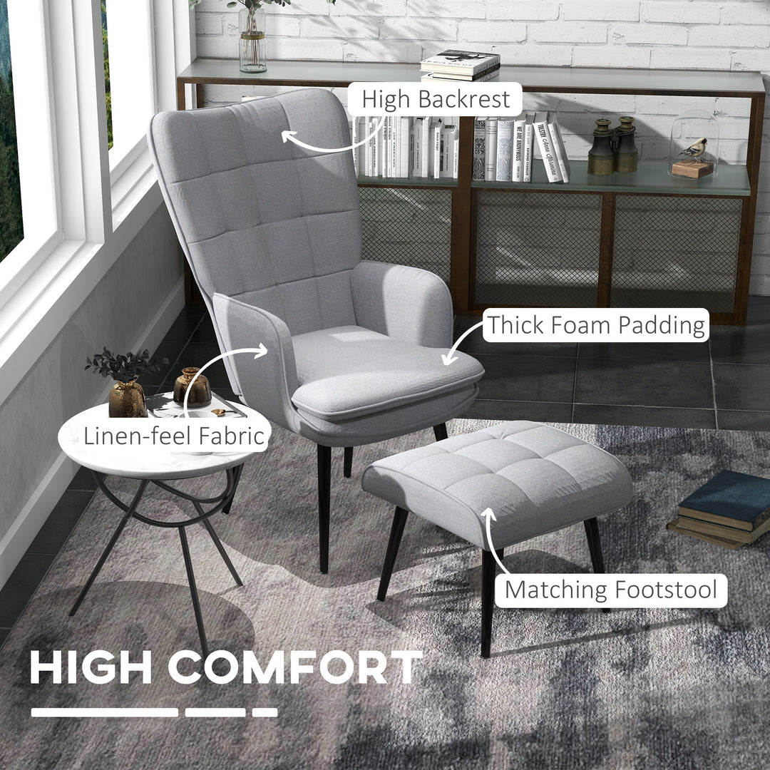Double the comfort - double the style. This HOMCOM set comes with a large armchair and footstool, so you can relax your body and rest up your legs, all at the same time. In a relaxed and modern shape, the armchair gives you plenty of room to lay back, with a padded seat for comfort and a high back for support. Linen-feel upholstery adds to the softness; paired with the painted steel legs for a luxe look. Complete with steel legs for strong support.