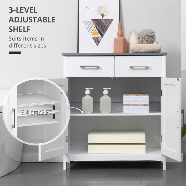 Expand the storage capacity in your bathroom with this cabinet from kleankin. Crafted of quality MDF board and clean finish that fit well with various bathroom for reliable use. Featuring two top drawers, one spacious cupboard with adjustable shelf, it can almost store all your bathroom essentials. The back can be attached to the wall with an anti-tipping strap, making it secure and stable. Bringing some handy space in the most beautiful way possible.