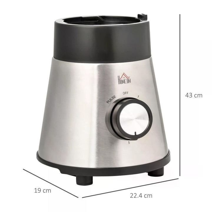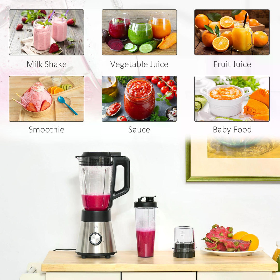 Blend and create your own delicious smoothies, shakes, sauces and more with this multifunctional blender from HOMCOM. The 1.5 litre capacity is large enough to serve up to three people. Features five speed settings - you can go from slow to fast depending on what you're whizzing up, with a 'pulse' knob for full power. It's powerful - 900W to be exact. Included grinder cup to chop nuts and even squeeze fruits. Set comes with: 1.5 litre jug with safety-lock lid, portable bottle and grinding cup.