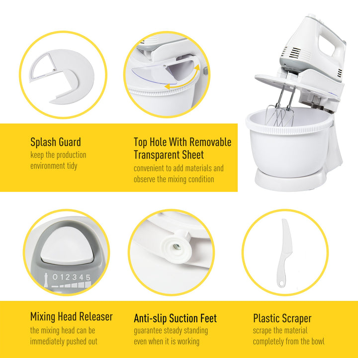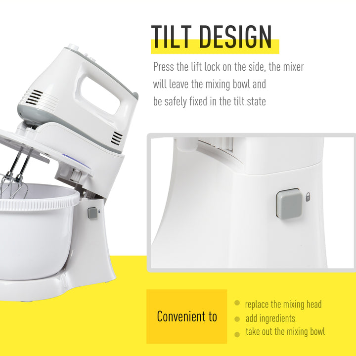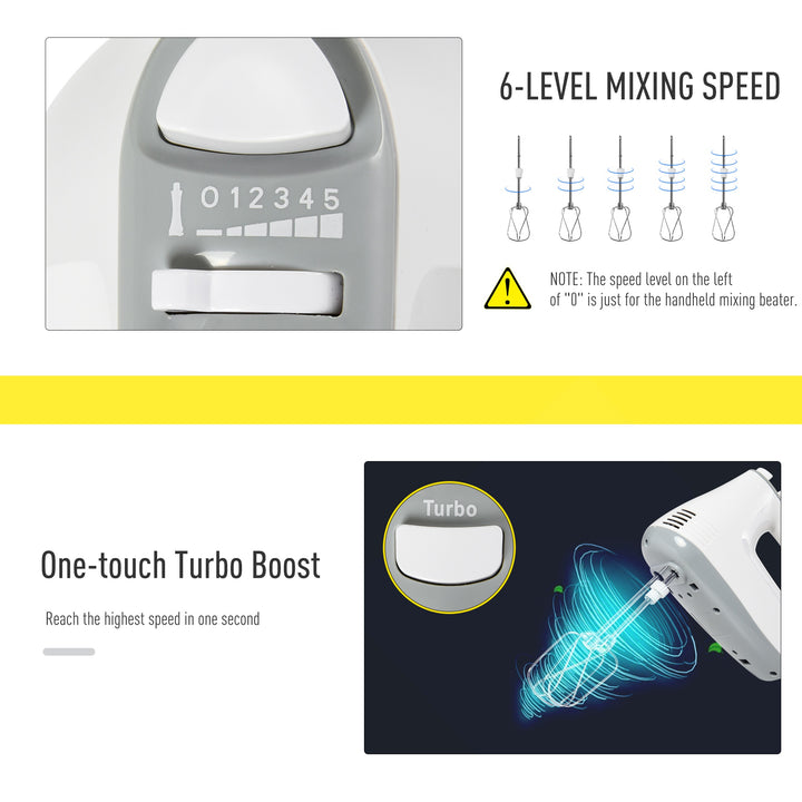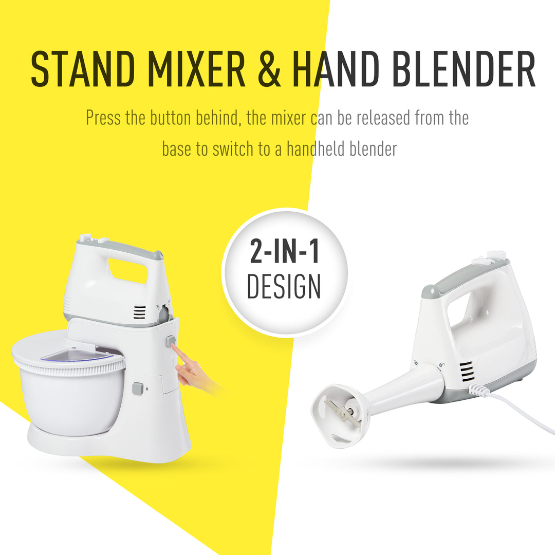 Home mixing for cooking and baking - done with twice the options. Grab this nifty mixer, from HOMCOM, to make your culinary delights easier than ever imagined. Two-in-one design is of a classic stand mixer, where the whisk part can be taken off to use in your hand. Also comes with three different heads - two classic, two dough hooks and one blender, giving you three different mixing heads to work with different foods and ingredients. Features six speeds - one turbo mode. Set comes complete with a large 3.4 litre mixing bowl and a splash guard to keep the worktop area clean with reduced mess.