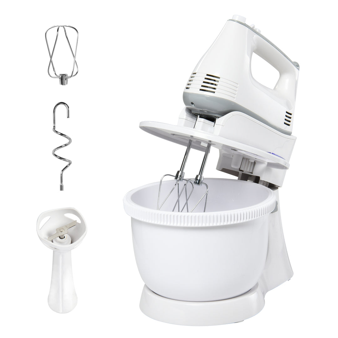 • Comes with 2 x classic whisks, 2 x dough hooks and 1 x blender head for a variety of tasks. Plastic scraper also included