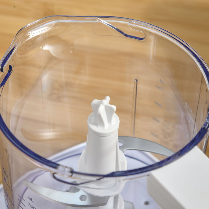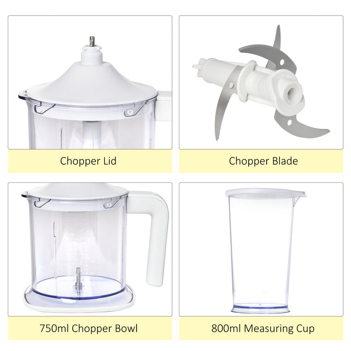 - Includes two flat beaters, two dough hooks, a whisk, hand blender, 800ml measuring cup and a 750ml chopper bowel