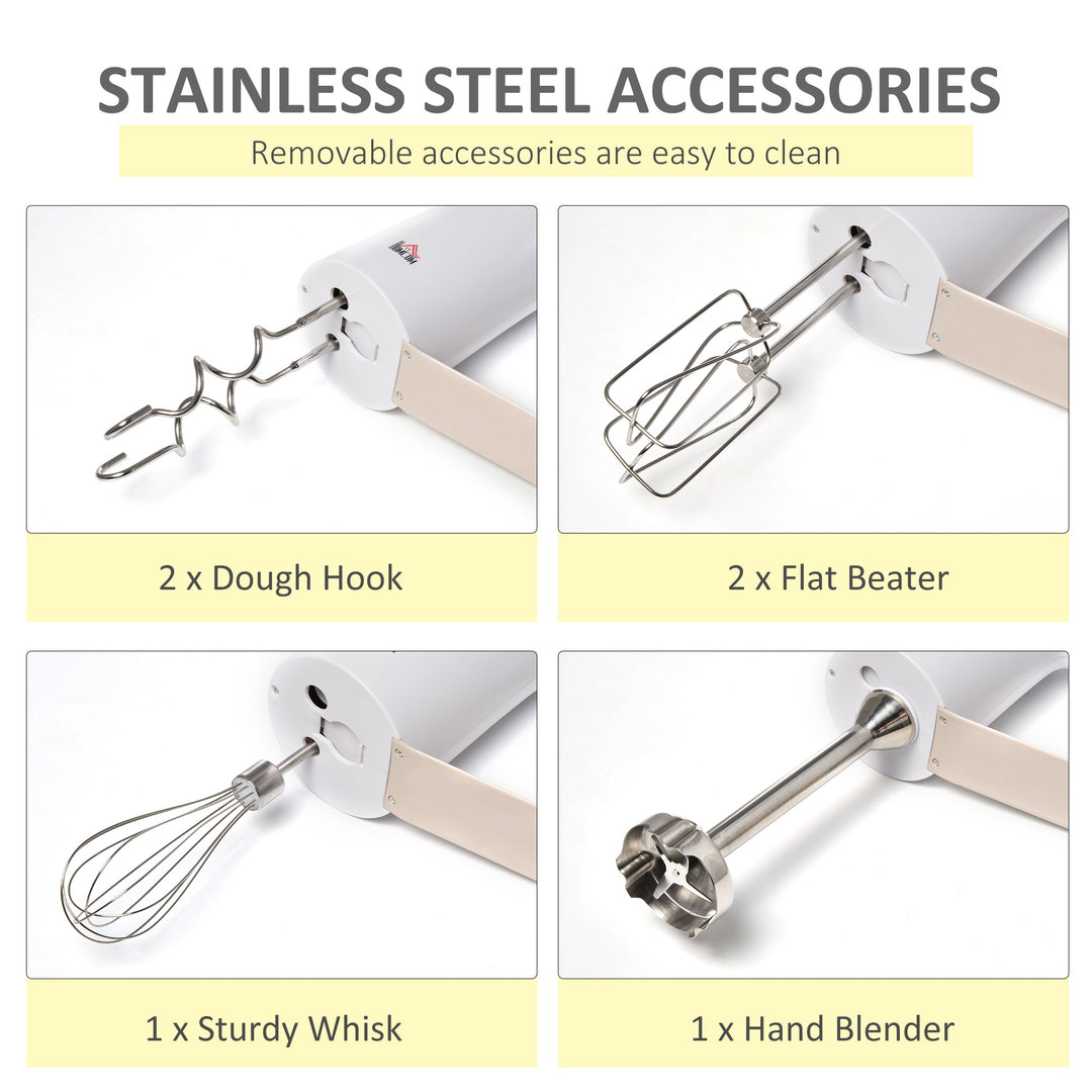 Baking and cooking have never been easier, thanks to this HOMCOM electric hand mixer. Whether you're baking cupcakes with the kids or whisking a delicious dessert for a dinner party – this nifty mixer will become a necessity in the kitchen. With changeable accessories, can you blend, crush, knead and whisk, so you'll enjoy prepping without the aches that usually come with it. With five speed settings and an additional pulse function, this versatile machine will make you top chef in the kitchen.