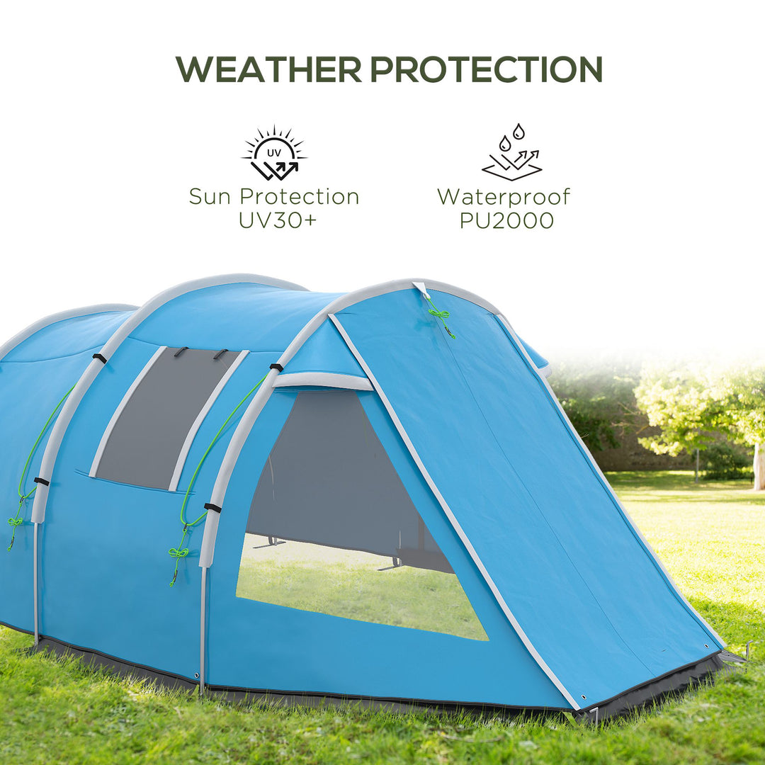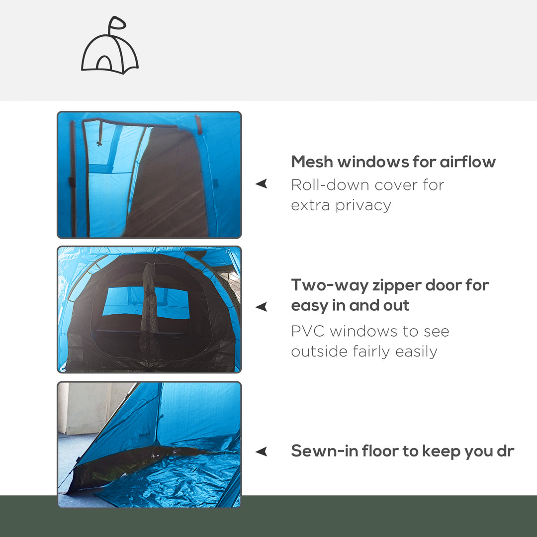 This Outsunny dome tent provides plenty of sleeping and socialising room for outdoor adventures. Using fibreglass poles that stays in shape, it's fitted with a 2000mm water-resistant polyester canopy for proper shelter. PVC windows for outside/inside views and mesh windows for ventilation, which have covers for extra privacy. The inner space of this 4 person tent is divided into two rooms, with double doors for easy access.