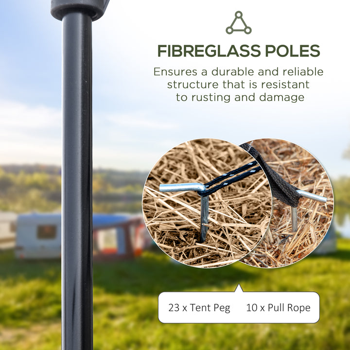 Camping number restrictions need not apply: this Outsunny 5-6 man tent provides plenty of sleeping and socialising room for outdoor adventures. Using fibreglass poles for a shape which stays in shape, it's fitted with a 2000mm water-resistant polyester canopy to shield you inside safely. The side and front windows provide increased airflow and allow you to see outside/inside easily. The inner room is removable - create a single room space, or keep it separated when required.