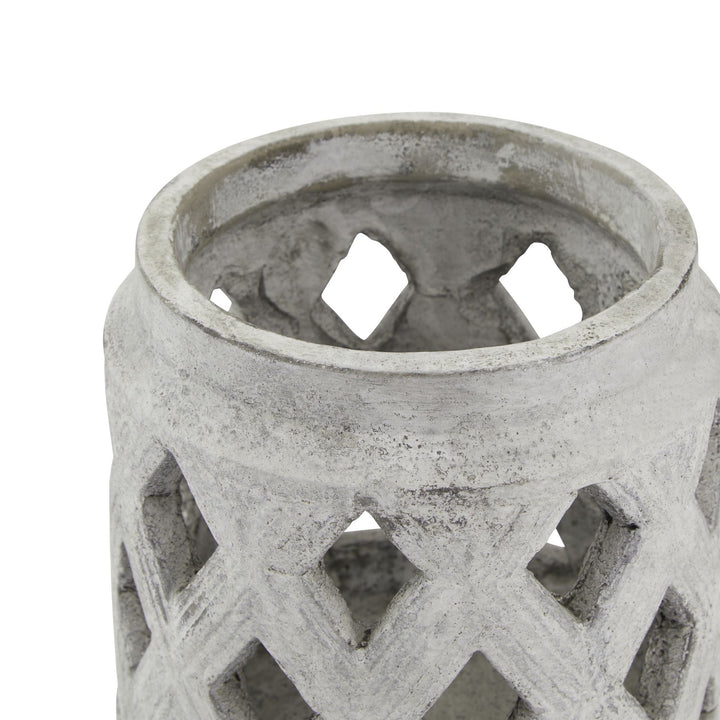 Introducing a remarkable stone lattice lantern that brings architectural intrigue to any space. The meticulously detailed geometric pattern creates enchanting light and shadow interplay, making it an ideal focal point for both indoor and outdoor settings. The neutral stone finish offers enduring appeal while complementing diverse décor styles. This lantern makes an exceptional addition to retail collections, particularly when paired with our coordinating Siena brown amphora pots, Garda grey glazed vases, and decorative eucalyptus sprays for a cohesive display that promises strong consumer appeal. The design's balanced proportions and quality construction ensure lasting value, while its versatile aesthetic makes it equally suited to modern or traditional merchandising schemes. For maximum visual impact, we recommend clustering multiple sizes of our lattice lanterns together and incorporating matt white ceramic column candle holders and beaded frame wall décor to create compelling visual merchandising opportunities that will drive sales.