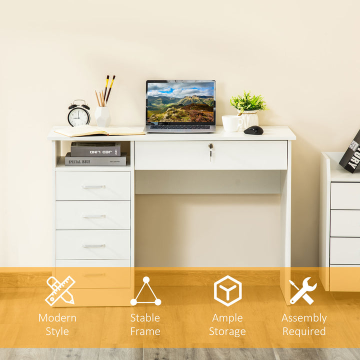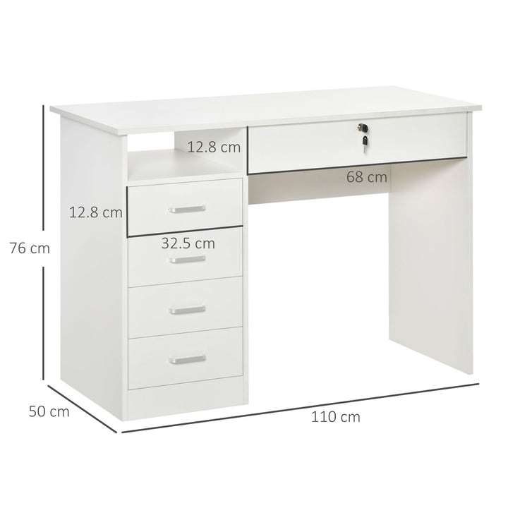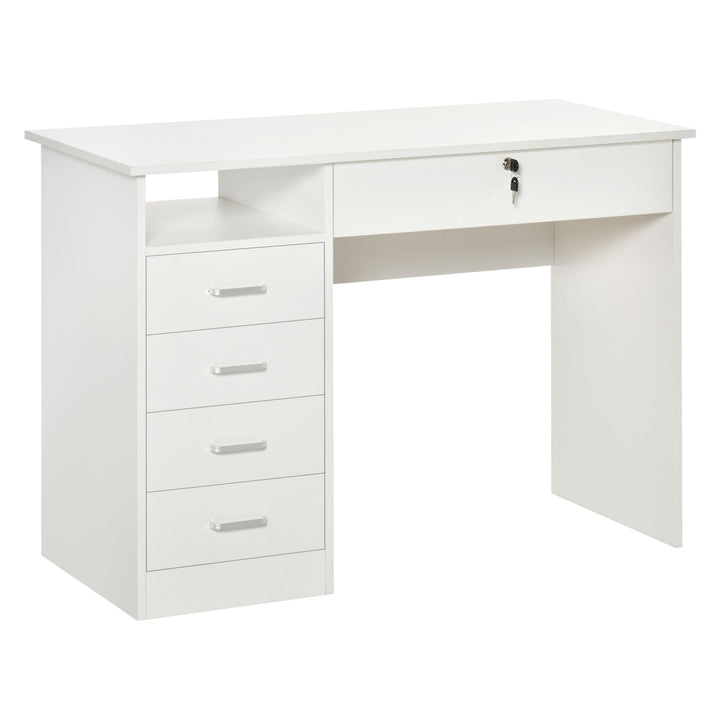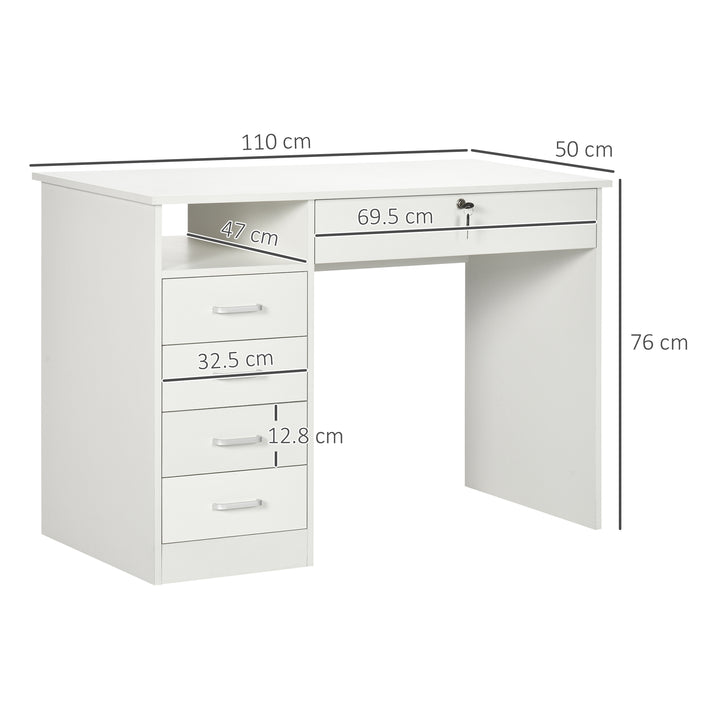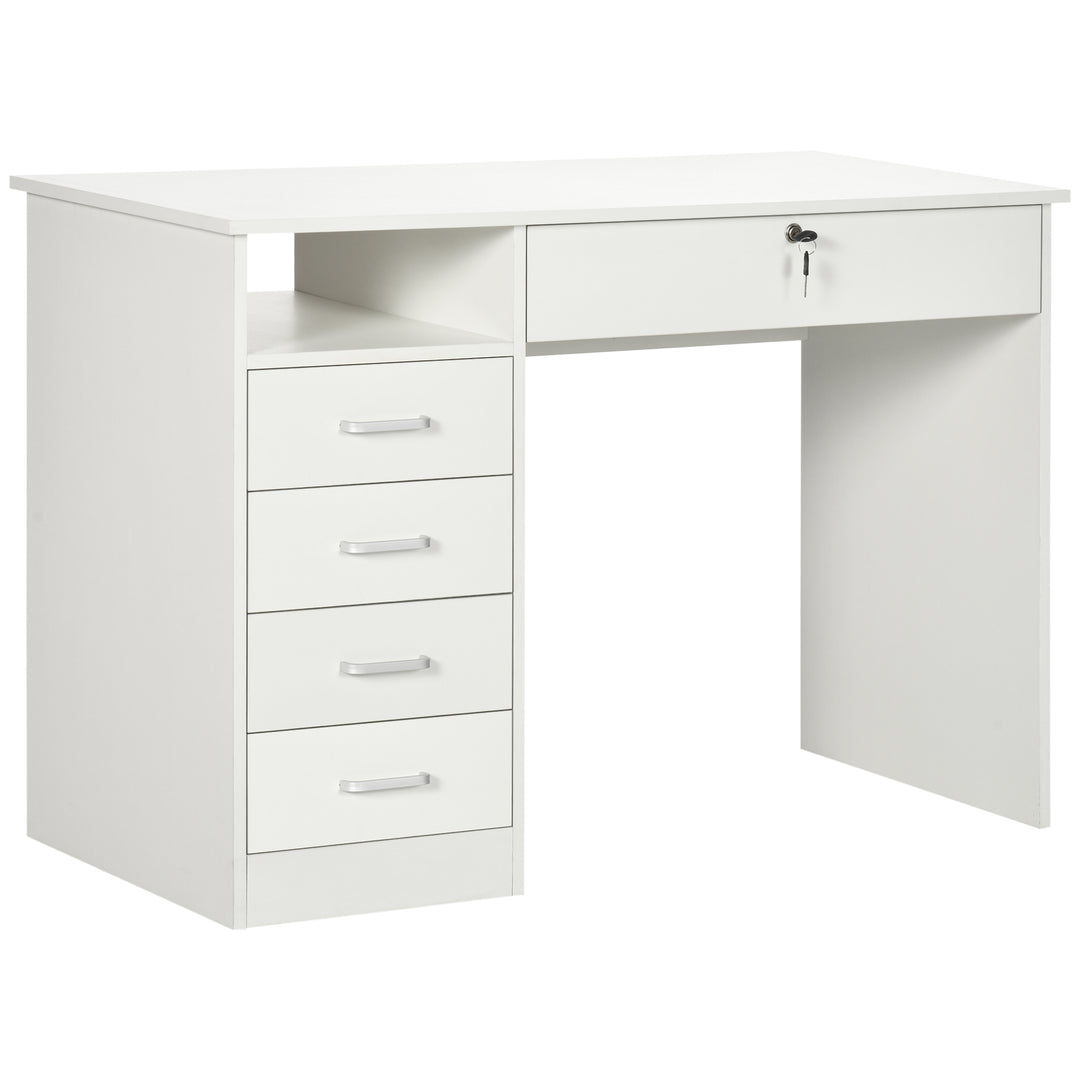 Require space to work and keep all office supplies organised? Then go for this HOMCOM computer desk with drawers. Comes with a wide table top and under-desk space to work from, shelf and five drawers. The below-desk drawer can be locked for security; two keys included. Compact design great for smaller spaces, particle board structure is sturdy and tough. The desk with storage is finished with handles on the left-side drawers to open and close easily.