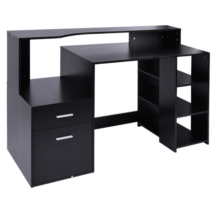 Take your office work set-up to the next level: go for this computer desk with drawers from HOMCOM. A multi-use design, it features three side shelves, a two-drawer storage cabinet, a large worktop and a high top back, giving you more than adequate room for working from and storing everything in a compact place. With stand-out metal accents to finish, this desk with storage is made with ultimate style in mind – something you'll love inviting it into your work space.