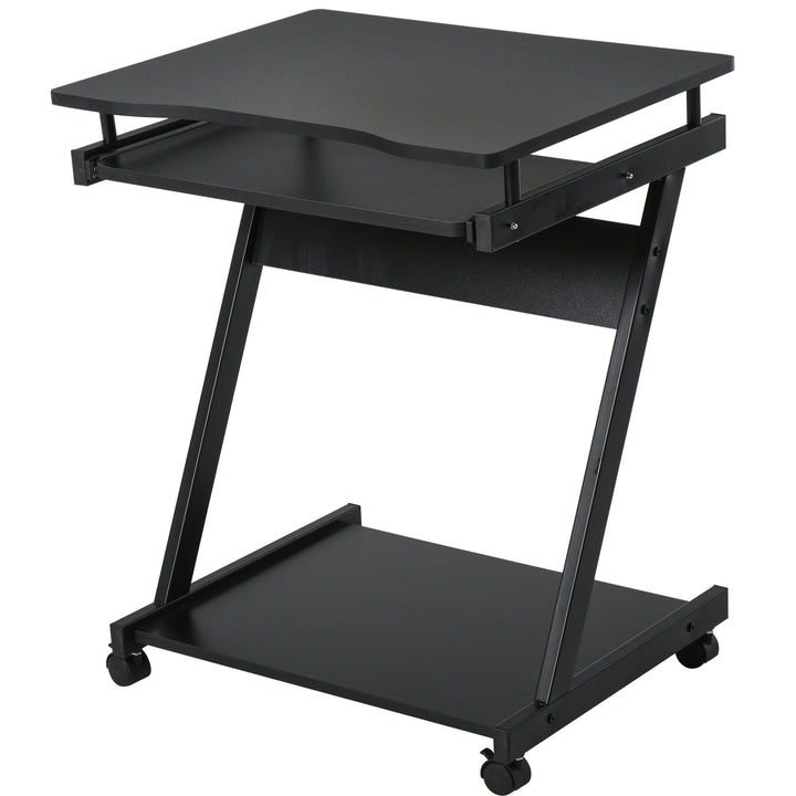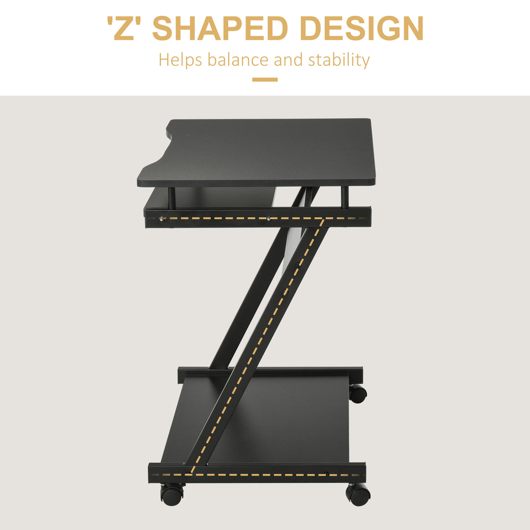 Keep your working times clean and clutter-free with this small desk for home office from HOMCOM. The frame is made of metal for a sturdy structure, crafted into a 'z' shape design which enables it to keep balanced and stable. It features an open tabletop, slide-out keyboard tray and bottom shelf, giving you plenty of room for working and storage. 4 locking wheels at the bottom, making this pc desk easy to move around and keep stationary. A modern piece perfect for all home and office spaces.