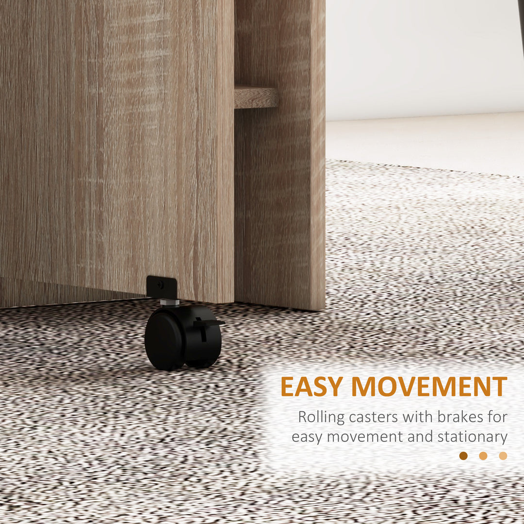 Make large unused tables at home a thing of the past. Choose this HOMCOM drop leaf dining table for extending surface space, whenever you need it. Both sides lift up and drop down super easily. Inside there are two shelves for close by and discreet storage - easy to keep things close to you. Complete with wheels to move easily, with brakes so it stands still, whenever you want.