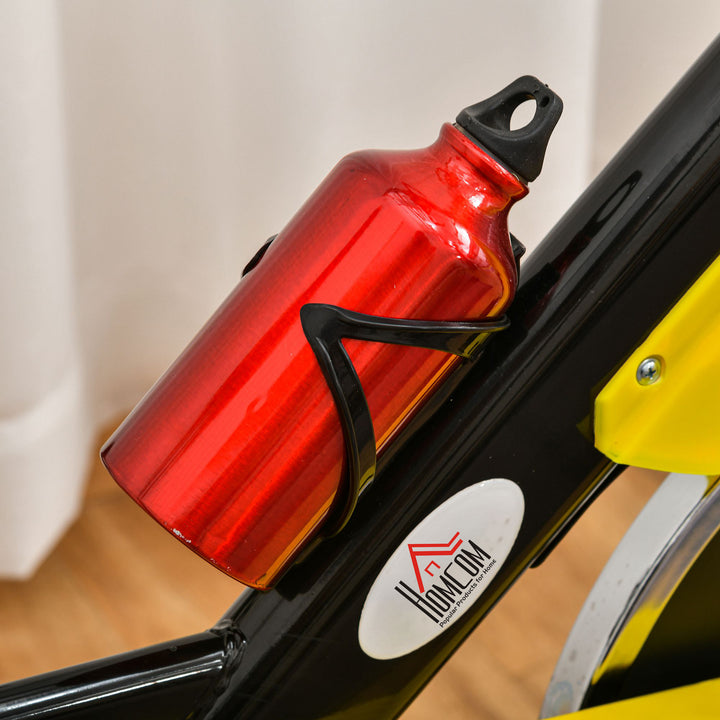 Improve your fitness and start achieving your goals at home with this HOMCOM stationary bike. Its upright design stands steady, with the two wheels allowing it to be moved easily for storage. The slim cycle features a resistance knob, so you can adjust the intensity to suit you. The LCD displays the time, speed, distance, and calories burnt, keeping you on track as you work out. Using heavy-duty steel with a belt-driven system and 6 kg flywheel, this fitness bike keeps stable and balanced when in use. A fun way to work out your upper and lower body, getting your body moving around.