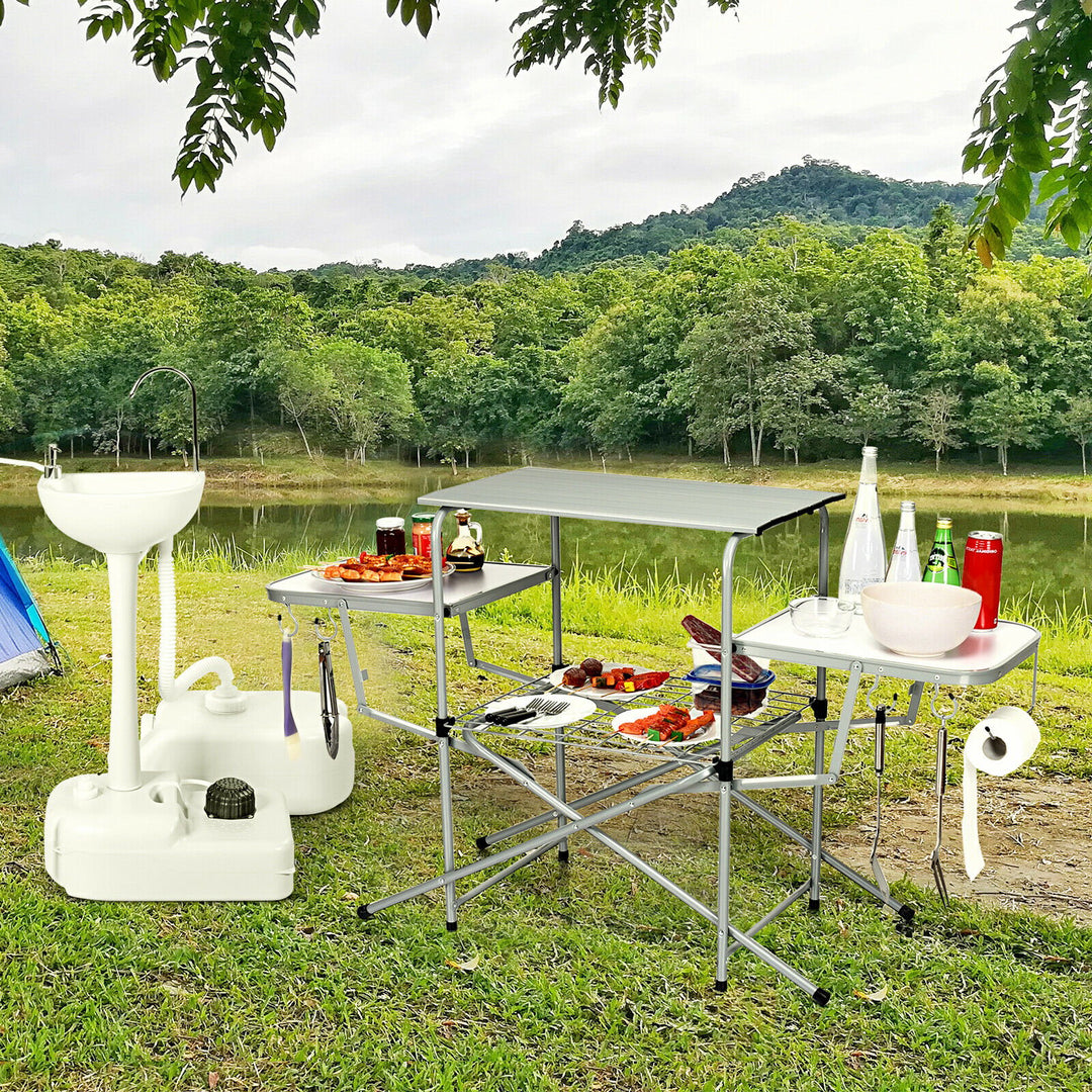The aluminium folding frame has a central aluminium tabletop, which is suitable for a table BBQ or gas stove, and with 2 MDF side tables and an under mesh table, there is ample room for everything you need, close at hand when cooking. The table also has hooks and a rail for utensils and a cloth. When not in use, the table folds and can be placed into the zippered bag, making storage and transportation easy. Heat-resistant aluminium central tabletop, perfect for a table BBQ or table grill Anti-slip rubber feet for stability Strong steel "X" frame, better stability 1 large central aluminium tabletop, 2 MDS side tables and a lower mesh shelf offers ample space Additional hooks and rail for utensils or cloths Simple, practical designed metal camping table Folds into a zippered bag for ease of storage or transporting Easy to fold and unfold for use