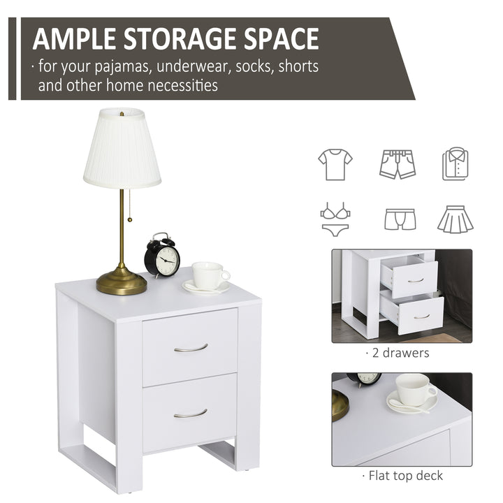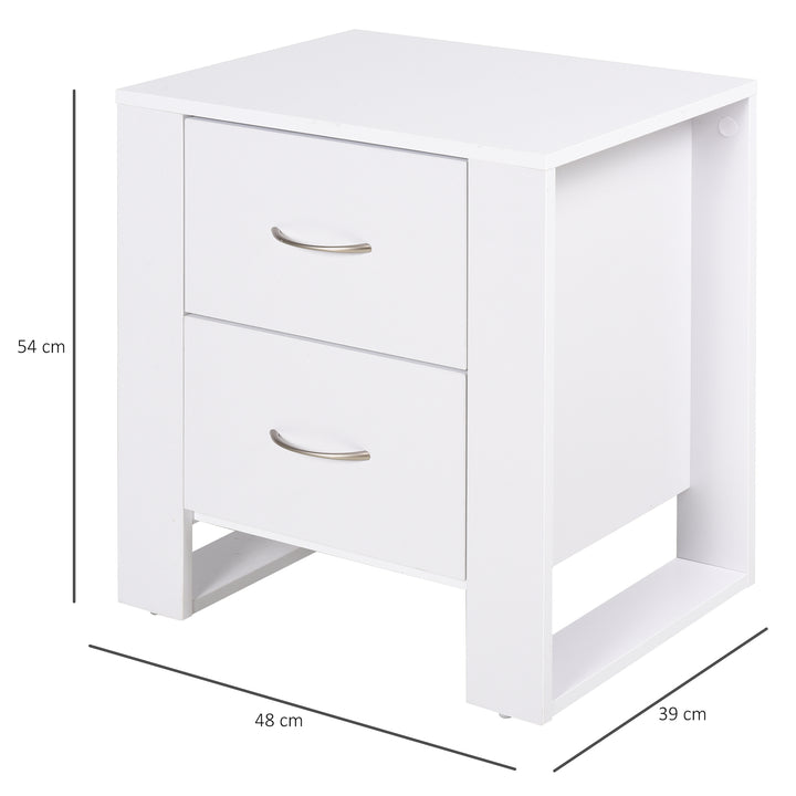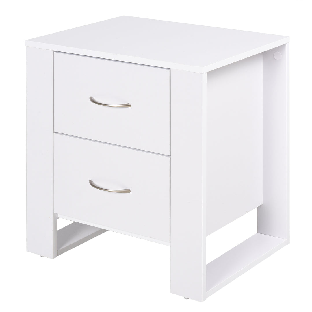 With its modern boxy shape, this end table is sure to bring in a luxe feel into your nightly routine. Its formed of two drawers, giving you room for keeping what you need stored within easy reach. Using particle board for the structure, it is solid and tough to withstand everyday use, and is coated with melamine for light protection against marks and stains. The side legs, which take up a large proportion of the size, provide complete balance and stability to the storage organiser.