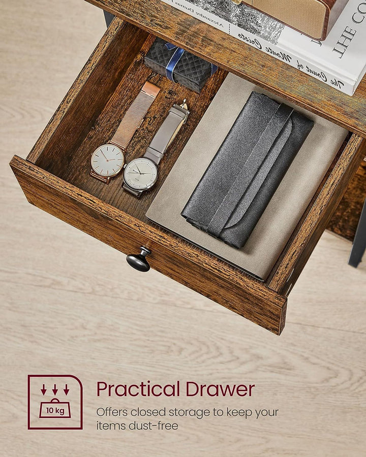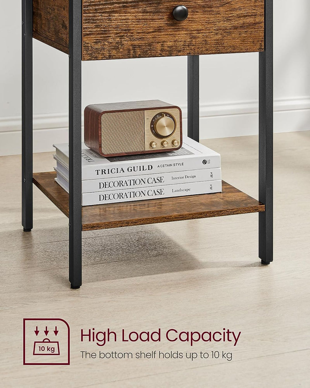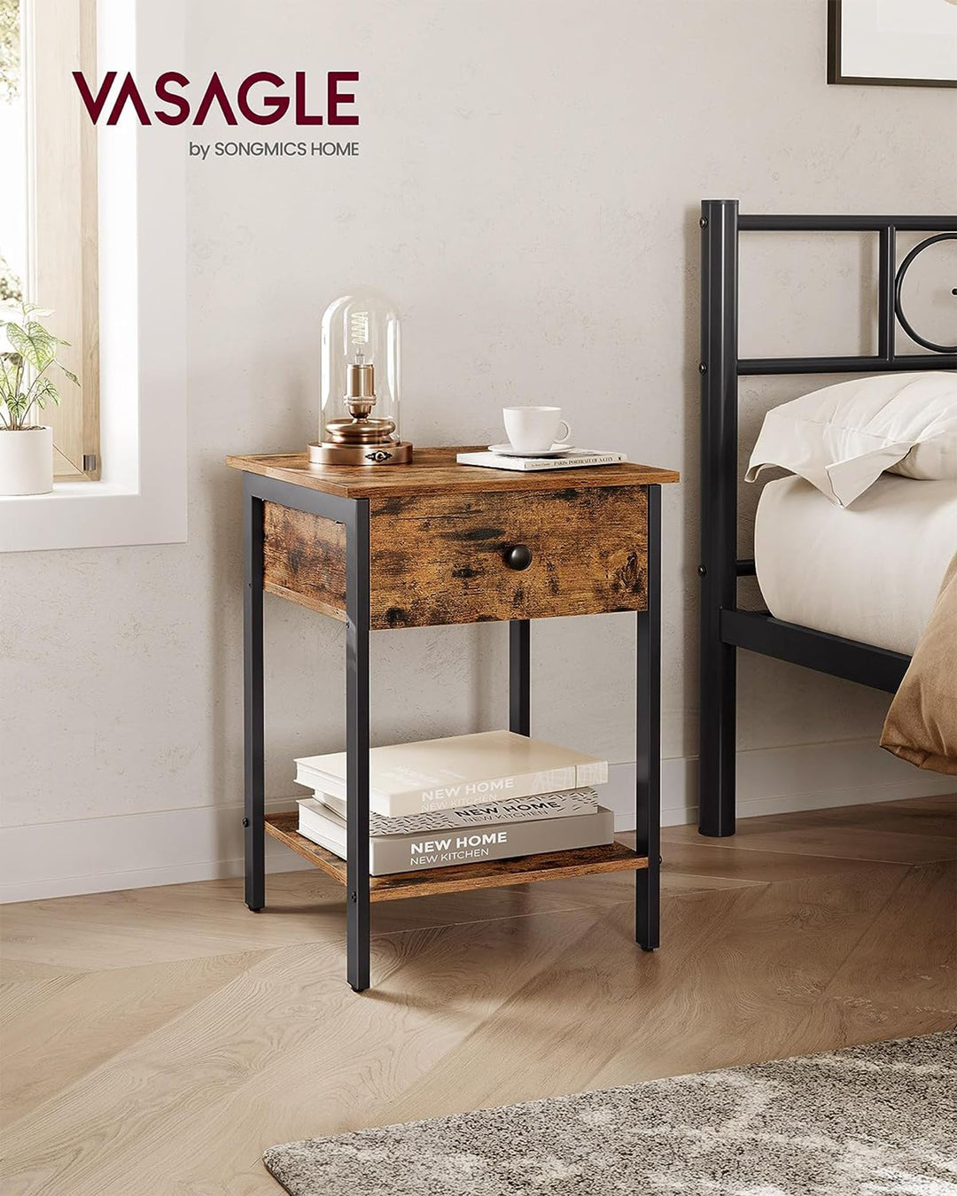 VASAGLE Nightstand, Bedside Table, Side Table with Drawer and Shelf, End Table, Bedroom, Living Room, Easy Assembly, Metal, Industrial Design, Rustic Brown LET55BX