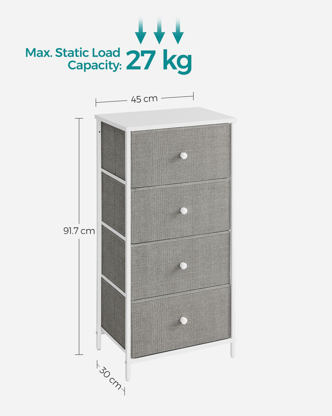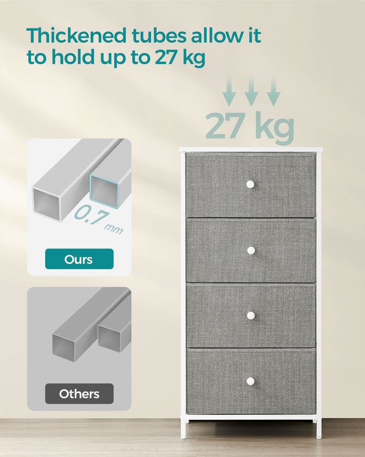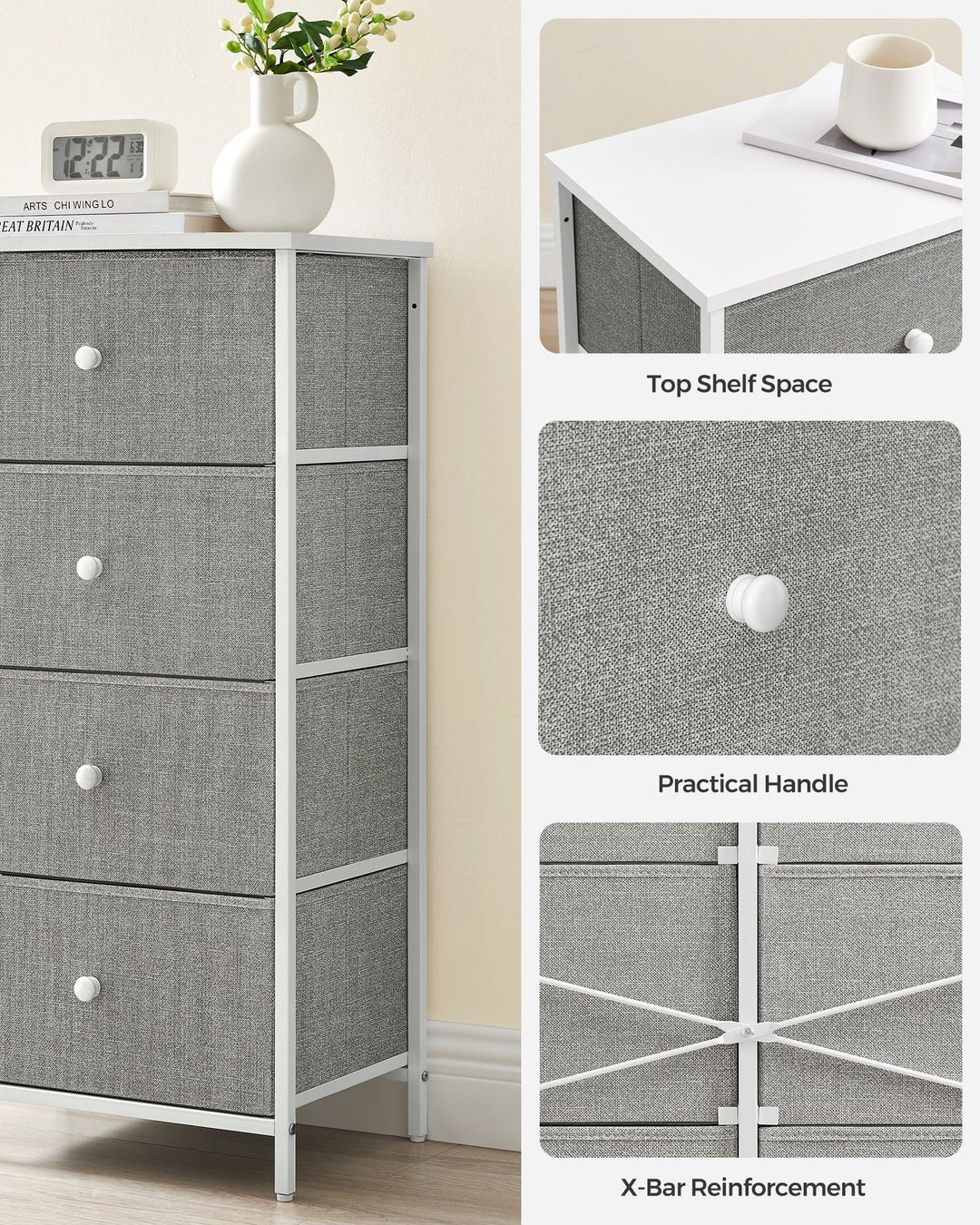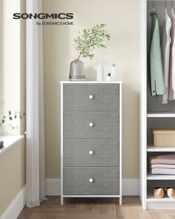 SONGMICS Chest of Drawers Bedroom, Drawer Storage Unit, Dresser with 4 Fabric Drawers, Metal Frame, Tall and Slim, for Closet, Light Grey and White LTS314L10