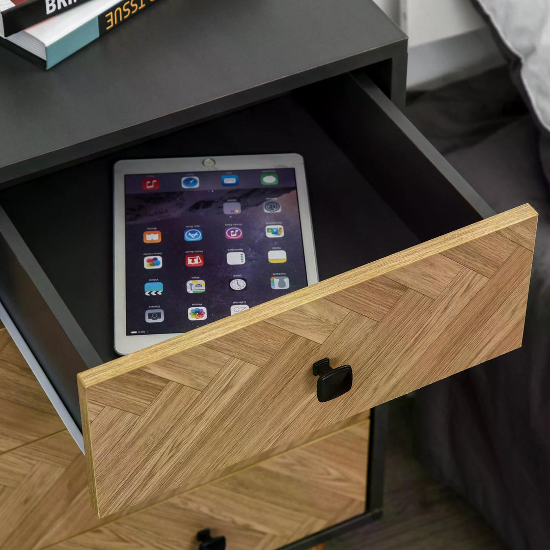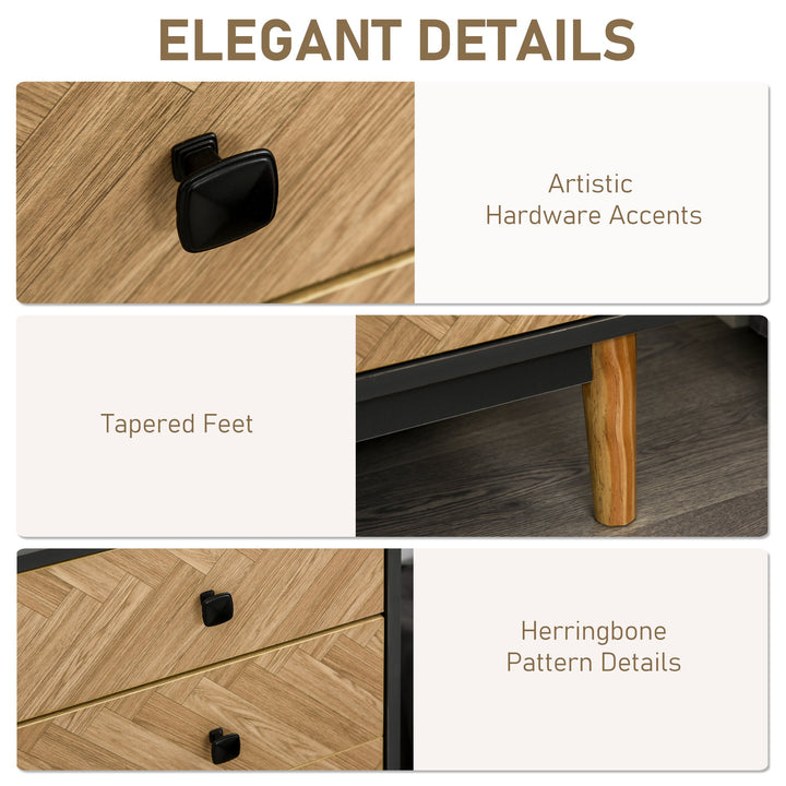 Ready to organize your home space? Pick up the drawer cabinet, and you'll be ready in no time. Bold light-dark contrast, unique herringbone pattern on five drawers, elegant tapered feet and coordinating square hardware accents fit most modern or traditional setting. 5 easy-glide drawers provides ample space for blankets, clothing and other items. Crafted of solid E1 particleboard and pine wood legs, It is a durable and attractive addition to living or bedroom space.