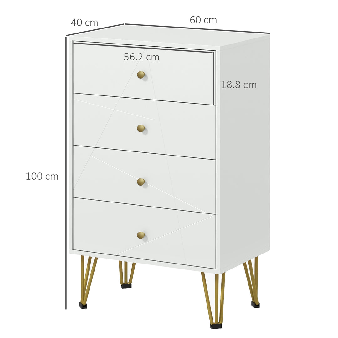 Simple style comes in the form of this HOMCOM dresser. A clean white design, these storage drawers feature a gently-indented pattern for slight point of difference. It comes with four equally-sized drawers, providing plenty of room for keeping clothes and more stored. Made from MDF, the body is sturdy, with a painted finish so you can wipe it clean easily. These bedroom drawers are complete with hairpin-shaped metal legs for plenty of support.