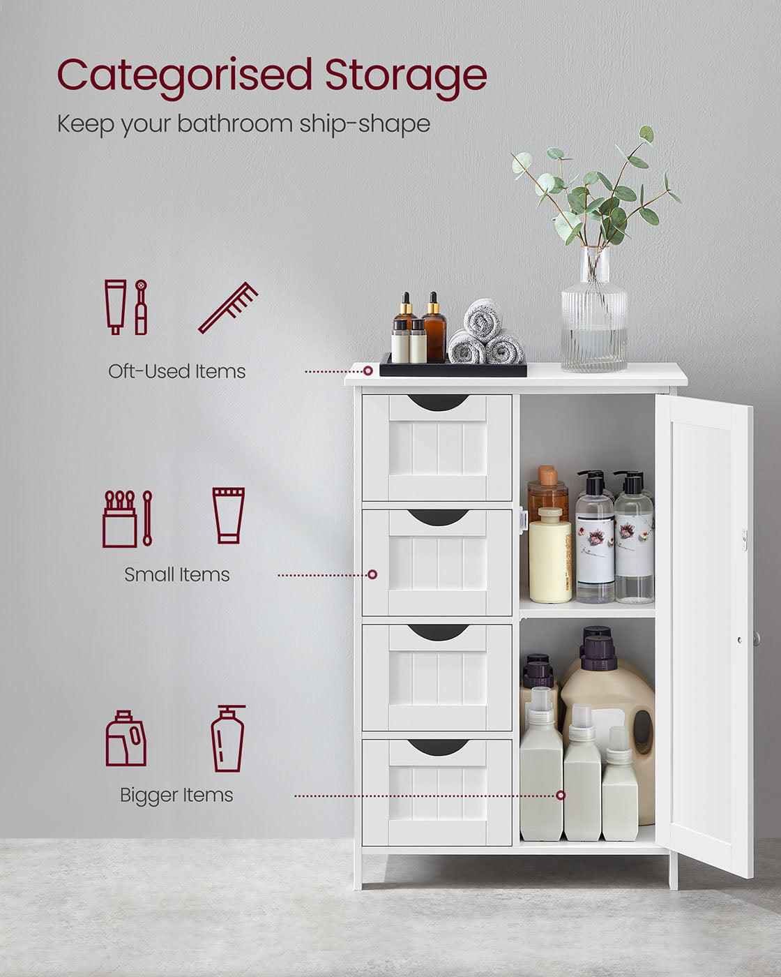 VASAGLE Cupboard Bathroom Cabinet with 4 Drawers and 1 Wardrobe Compartment in White Wood 55 x 81 x 30 cm (B x H x T) LHC41W