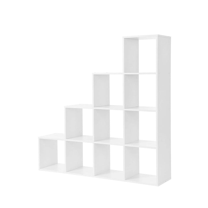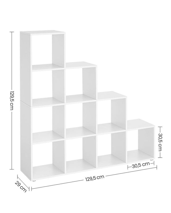 VASAGLE Bookcase, Stair Organiser, 10 Open Cubes, Wooden Display Shelf, Free Standing Shelf, 129.5 x 29 x 129.5 cm, Room Divider, White LBC10WTV1