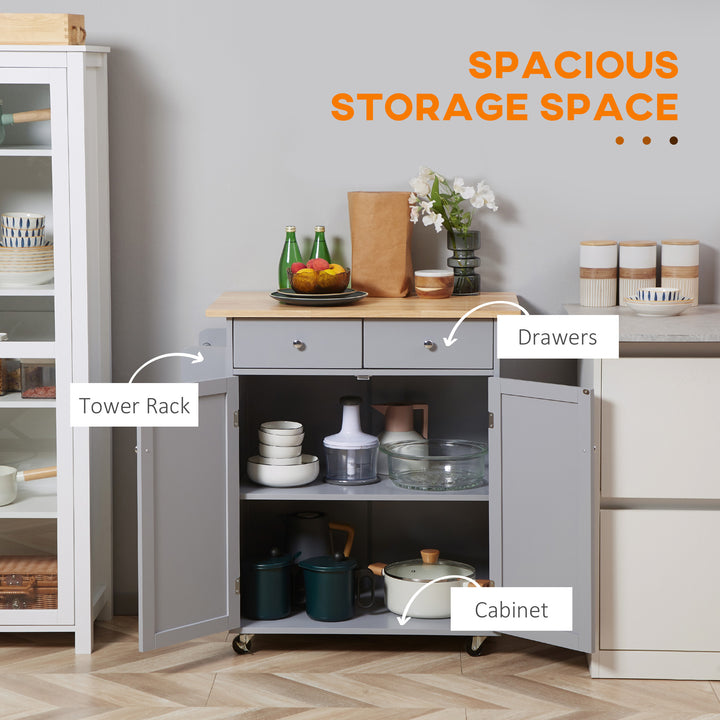 This prep & serving cart well fits limited spaces and can be moved to wherever you need it. 2 pull-out drawers, a double-door cabinet and a towel rack provide lots of space for supplies and accessories. Easy-roll wheels allow you to move wherever it is needed most. Solid rubberwood tabletop and MDF panels ensure sturdy construction and easy cleaning.