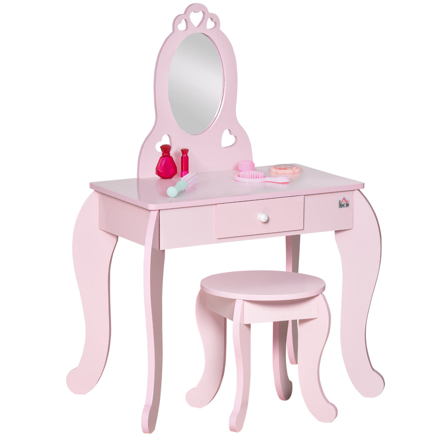 Princess perfect in a set. This dressing table and stool, from HOMCOM, is a noble way for them to get ready day and evening. Pink in colour, it features heart cut-outs on the top and side of the mirror for extra magic. The curved legs of the table and stool create a modern and relaxed look. There's a small drawer for keeping accessories safely stored. The mirror allows your child to get ready - whether just pretend getting ready, or going out to see friends.