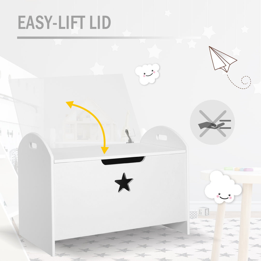 Made from MDF and crafted into a spacious 46.5 x 62cm design, this fresh white storage box is the perfect addition to your child's room to store all their toys, books and odd bits and bobs. Sturdy in construction to suit children of all ages, it features a handle-style groove and safety hinge to lift the lid up easily and keep it in place, two handles for easy carrying and an elevated base for extra protection to the box. Finished with a cut-out star on the front for extra character.