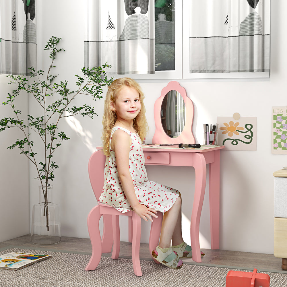 - A kids dressing table set, which includes a vanity table, matching stool and a mirror