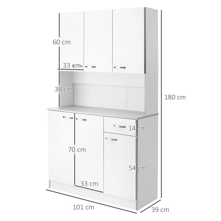 A multi-storage kitchen dresser which gives you multi-storage space: this HOMCOM tall cabinet. It features top and bottom cupboards, a drawer and open middle shelf; each cupboard comes with a three-level adjustable shelf so you can fit in smaller and larger pieces. A clean white colour for a modern look, this storage cupboard is complete with silver-coloured handles for a sleek look.