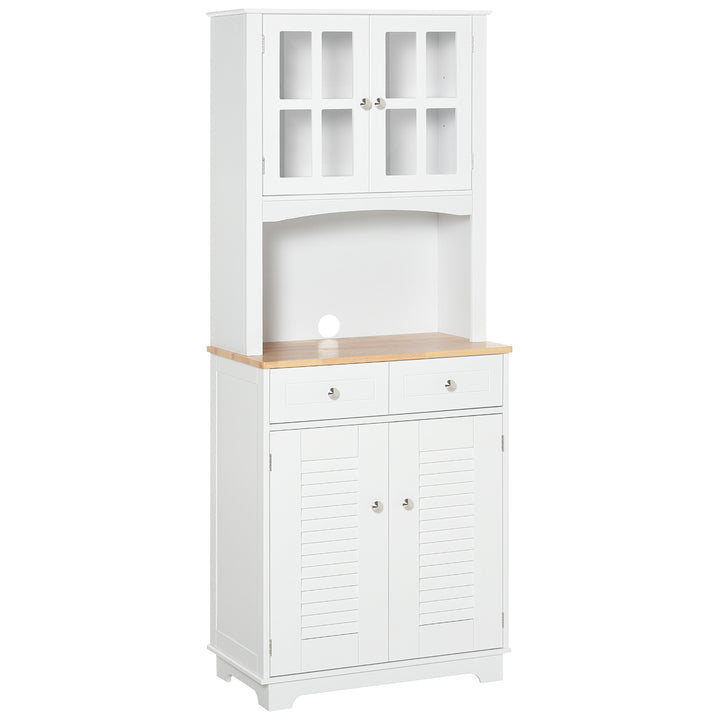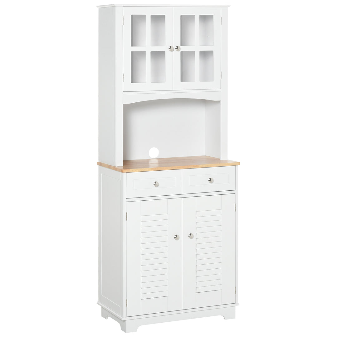 Bring style and space into your kitchen with this HOMCOM kitchen storage cabinet. Crafted from MDF, it's a long lasting addition to your home furniture. Spacious in design, it features a top and bottom cabinet with multiple adjustable shelves, two pull-out drawers and an open wooden countertop, ensuring you have plenty of space in the kitchen. With a smooth surface top to ensure easy maintenance, the kitchen pantry cupboard is finished with an anti-tipping straps on the back for safety.