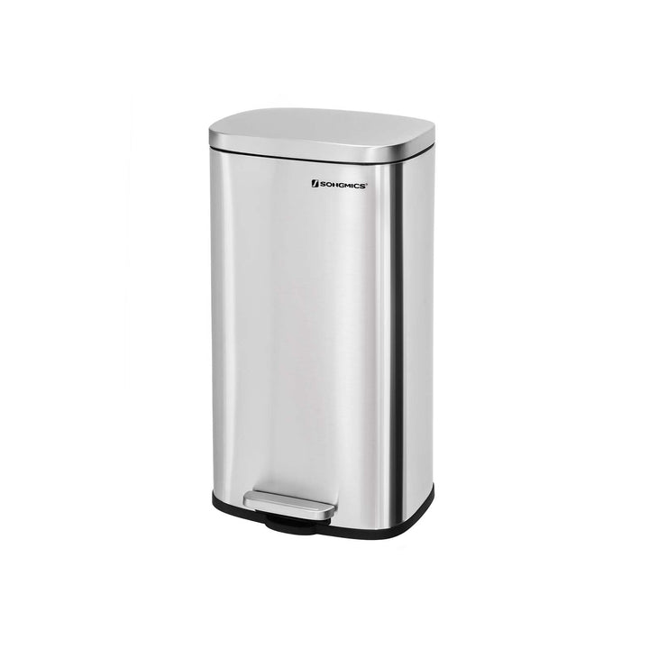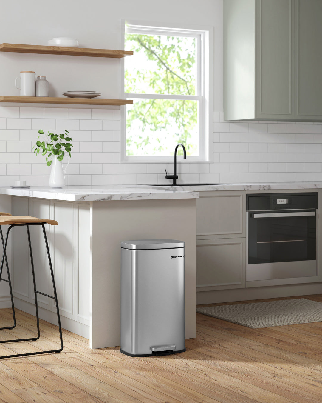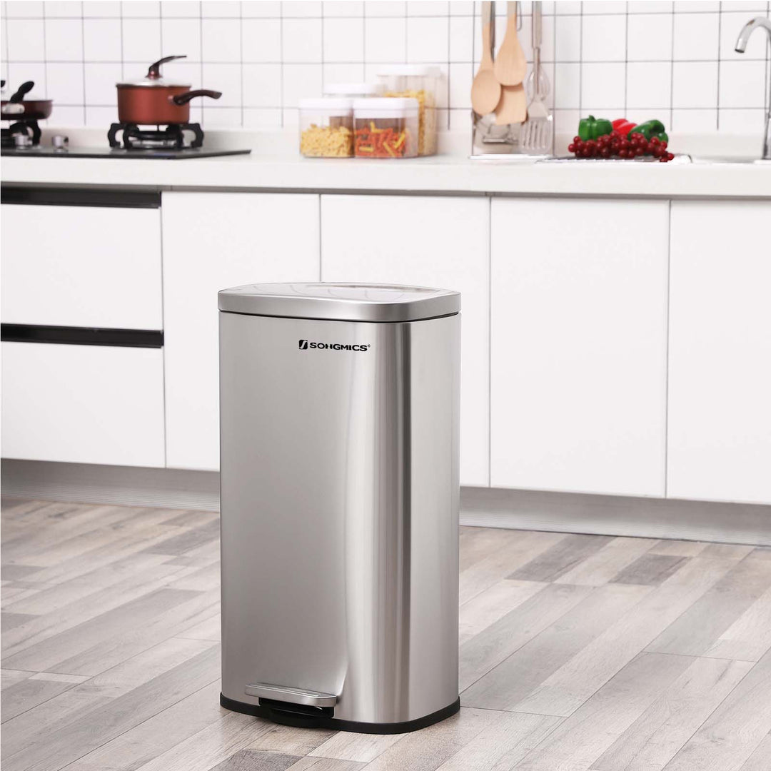 SONGMICS Kitchen Pedal Trash Bin with Hinged Lid and Plastic Inner Bucket, 30 Litre Stainless Steel Rubbish Garbage Can, Soft Close, Odour Proof and Hygienic LTB03NL