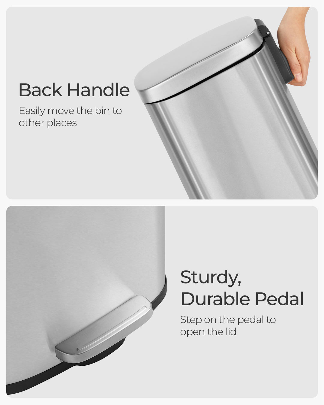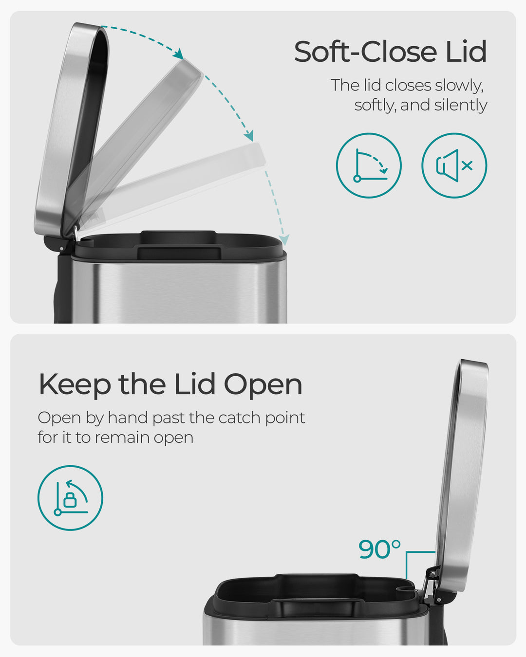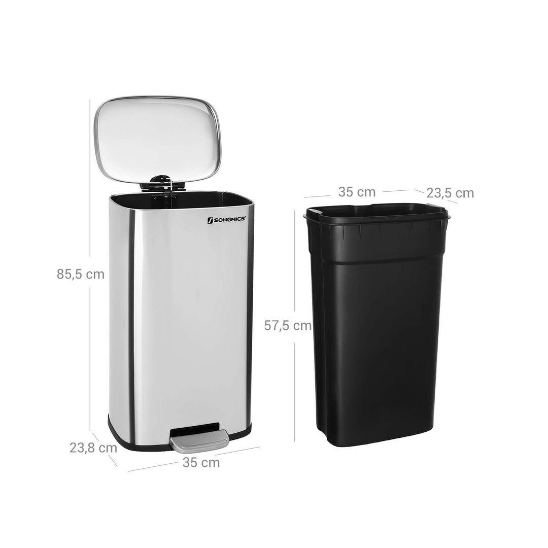 SONGMICS Kitchen Pedal Trash Bin with Hinged Lid and Plastic Inner Bucket, 30 Litre Stainless Steel Rubbish Garbage Can, Soft Close, Odour Proof and Hygienic LTB03NL