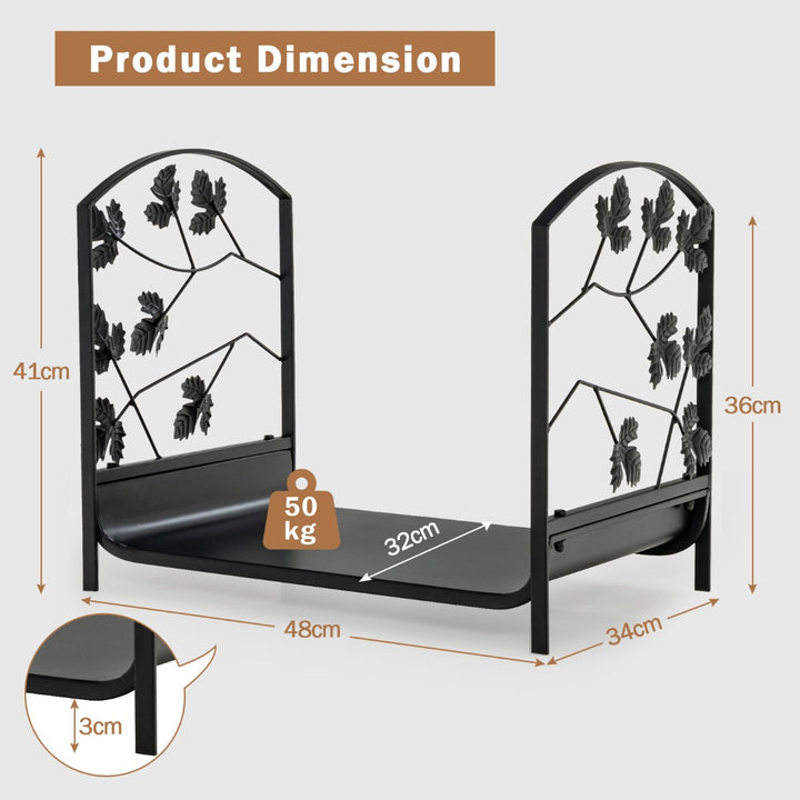 - With 110lbs loading capacity, this firewood rack can keep logs stable, safe and organized. Measuring at 19" in width, this storage rack holds enough wood for a comfortable fire side night. And its elegant look with leaf patterns will make for a gorgeous addition to indoor outdoor places. The small, practical and stylish log rack can fit on the outdoor back porch, back yard deck, fire pits, under eaves, indoor garage, family room, and patio. The simple rack is easy to assemble with installation instructions and accessories. Durable and Stable Construction: Made of thicken square steel tubing, this log rack ensures the durability and stability for long-lasting use. This small yet sturdy firewood rack can firmly load up to 110 lbs. The surface of fire wood holder is powder-coat, finish - durable and weather-resistant with good surface treatment. Enough Storage Space: With a spacious open design, this wood storage stand rack provides roomy space for storing, drying or displaying your firewood. Your logs can be orderly piled up on this the firewood for easy access, making your home look clean. This log stand holds enough logs to keep a nice warm without having to go get more wood. Decorative and Functional Use: With exquisite leaf pattern design on both sides, the simple log rack looks more elegant and matches well with home decor. This functional firewood log rack can not only be used indoors by the fireplace or wood-burning stove; but also can be used outdoors by the backyard fire pit or fire ring. Perfect Compact Size: This small compact log rack measures 48 x 34 x 41 cm (L x W x H); make a great bonfire accessory to keep firewood handy. It is lightweight to removed and easy to be stored when not in use. Moreover, this firewood rack keeps the wood 1 inch off the ground, which can improve air flow and prevent away from dampness and bugs. Easy to Install and Clean: Come with detailed instructions and necessary hardware in the package, this log holder is easy to assemble in a short time. Its simple structure also facilitates assembly process.In addition, the smooth surface is waterproof, which can be cleaned with a cloth and maintain its original look.