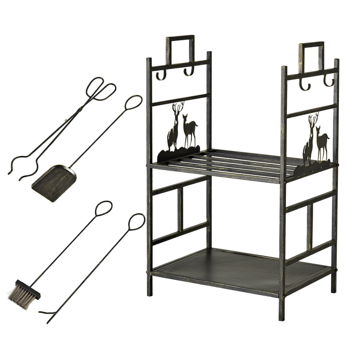 Many people enjoy the glow and warmth giving by the traditional wood fireplace, but there's a problem that the fuel runs out easily if don't get enough wood stock. With this 2-layer firewood rack by Outsunny, no more worries about the fuel. The firewood rack is made of wrought iron, firm and durable base allows it to hold a good amount of wood to keep your fireplace going all day. 4 practical gadgets are included with the product to help handle your firewood and can be hung on both sides of the product when not in use, without taking up extra space. With our products, you will have a warm winter!