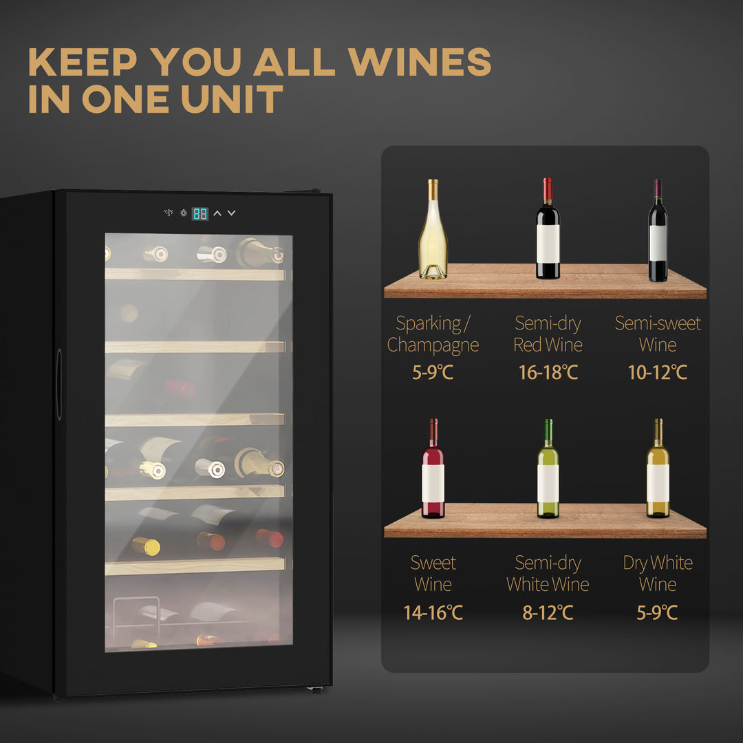 Ensure your wines remain pleasantly cold and prepared for your enjoyment with HOMCOM's wine fridge. The tempered glass panel, accompanied by inner LED illumination, facilitates effortless content visibility. You can regulate the temperature between 5-20_, which also features an LED display to monitor the chosen temperature setting. Experience the convenience of impeccable wine storage and presentation, all made possible by HOMCOM's exceptional home bar fridge.