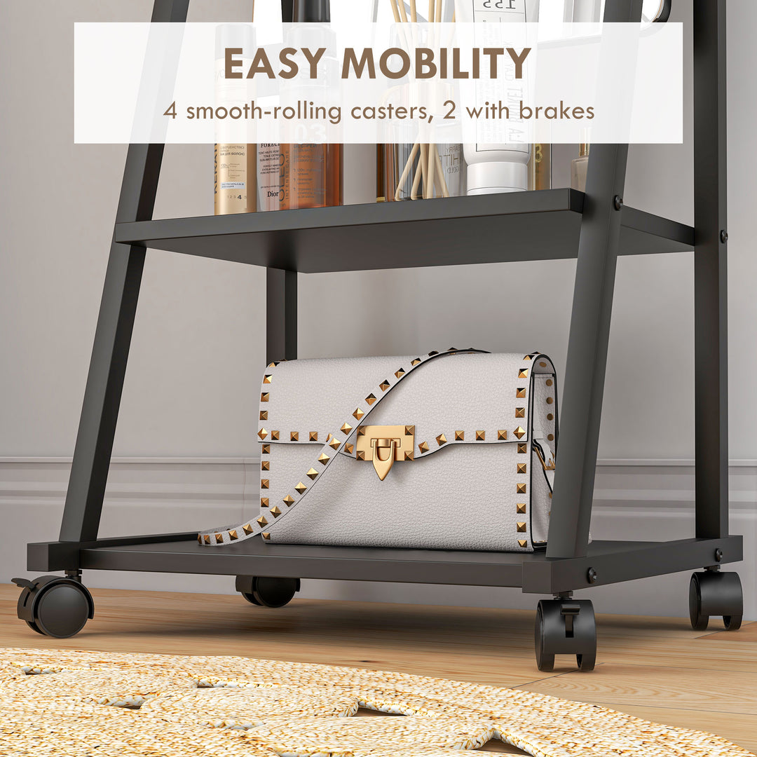 Walk out the door ready-to-go: use this HOMCOM freestanding mirror to ensure you are looking your best. The long length design means you can see yourself fully so you get your outfit in too. The mirror angle is adjustable to a 70°, 75°, 85° and 90° angle - select and secure to a position you want. A metal frame for a strong structure, complete with two handy bottom shelves.