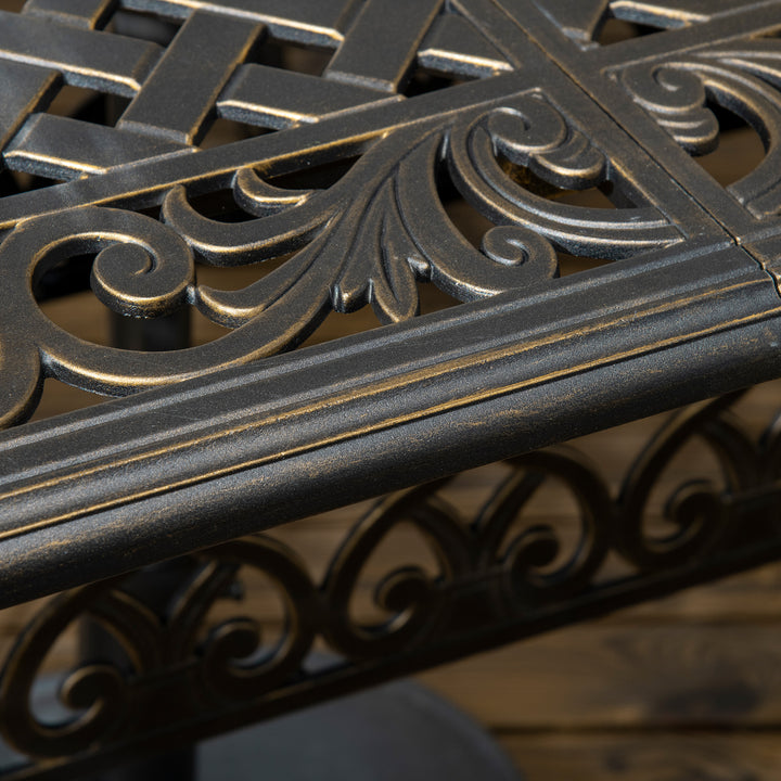 The garden table and chairs set includes six chairs and matching table with an umbrella hole - you've got everything you need to dine and relax with family and friends. Cast aluminium structure makes all pieces strong and sturdy, suitable for plenty of outdoor use. The seats come with cushions for comfort; their curved backs and arms offer body support. Place your parasol in the middle table hole to keep protected from glaring sunlight.