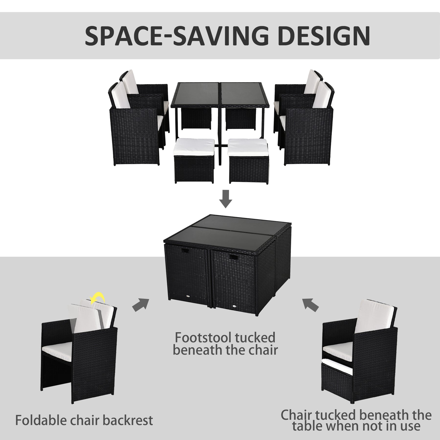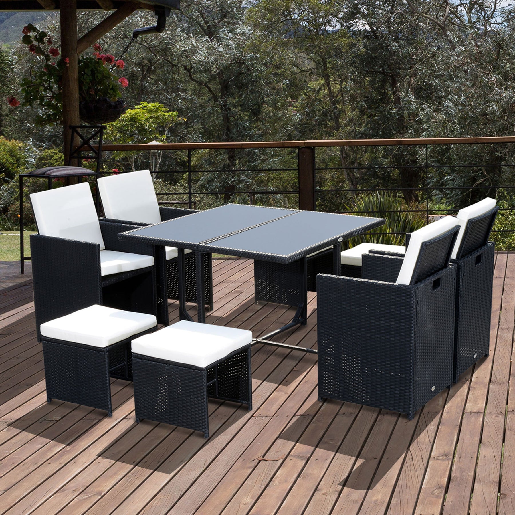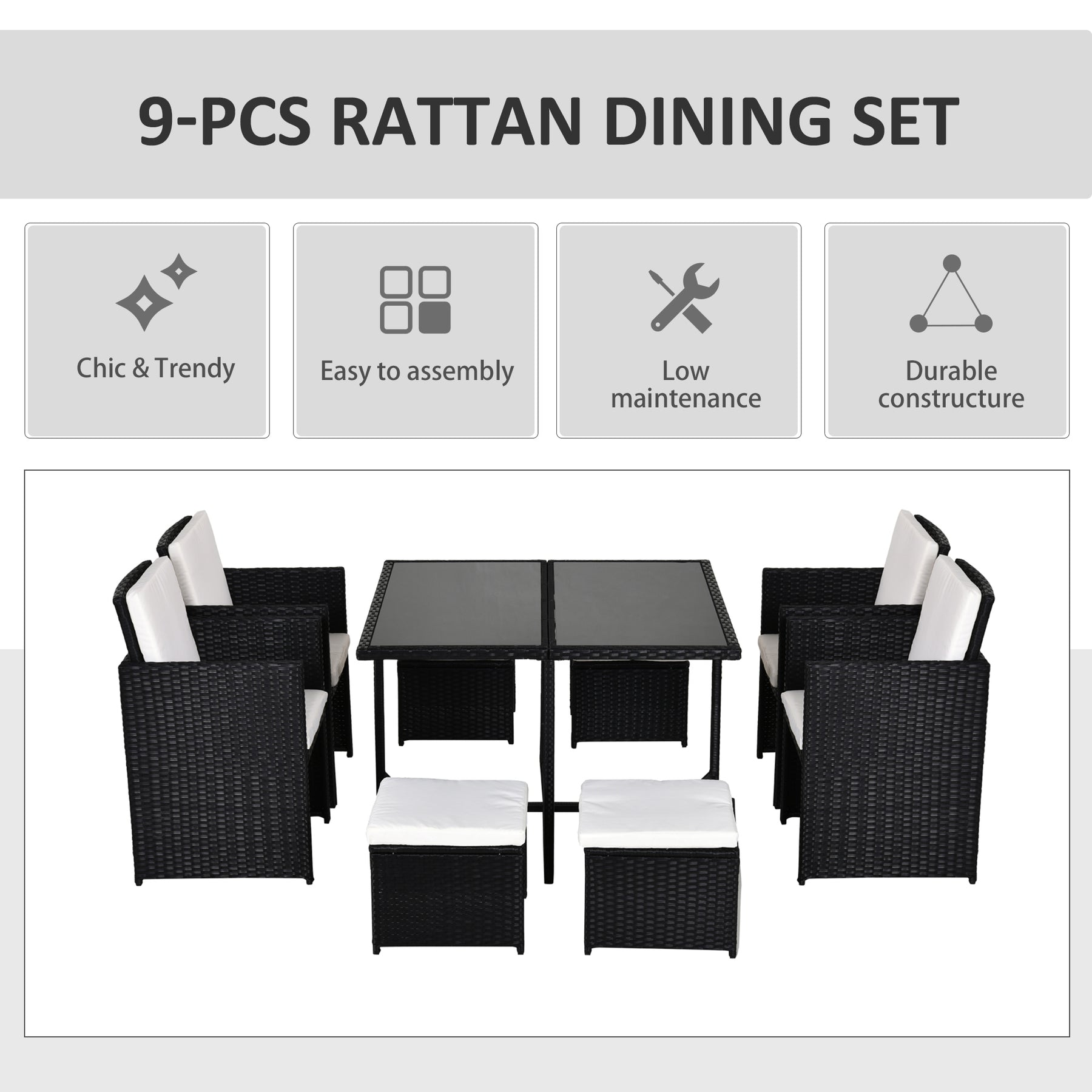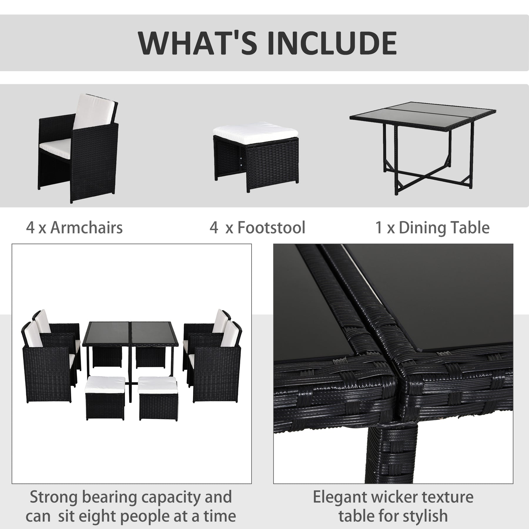 - Nine pieces: a table, four chairs and four stools - plenty of room for everybody to gather round