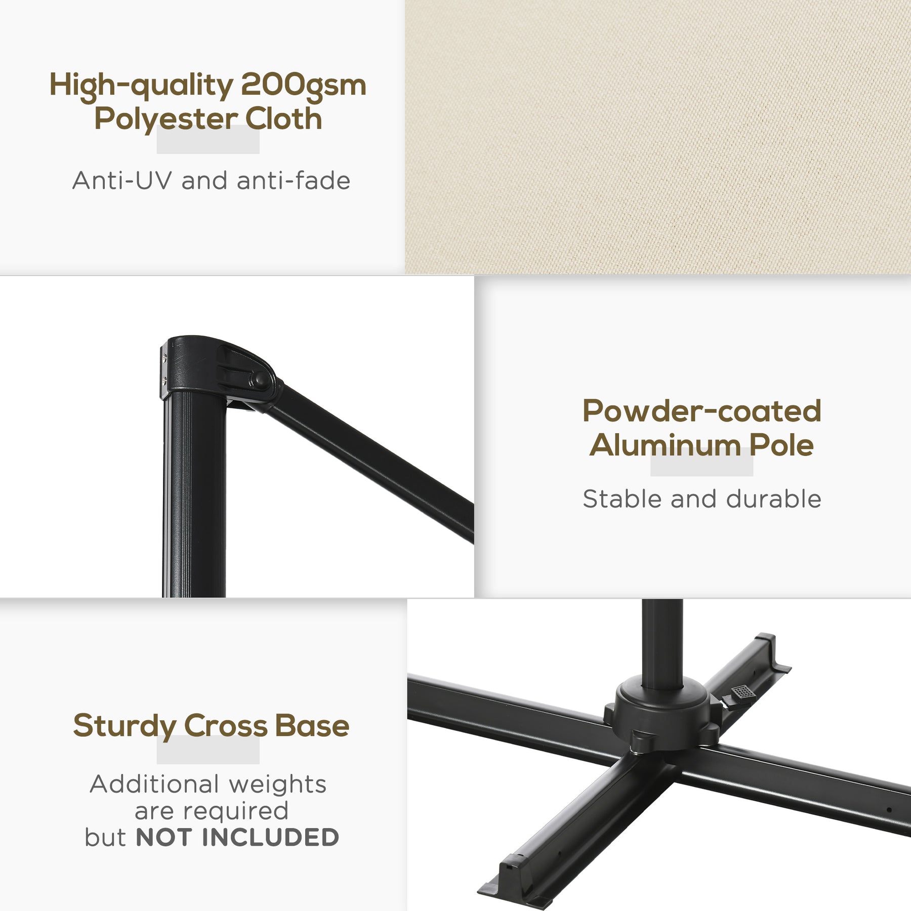 Ensure you keep yourself protected enjoying the sun, thanks to this Outsunny cantilever parasol with base included. A powder coated aluminium pole means a strong, supportive core. The polyester fabric shade keeps you protected from UV rays. It's adjustable to three positions and has a 360° movement: set it to any position you want - the must-have partner for all-day relaxing.