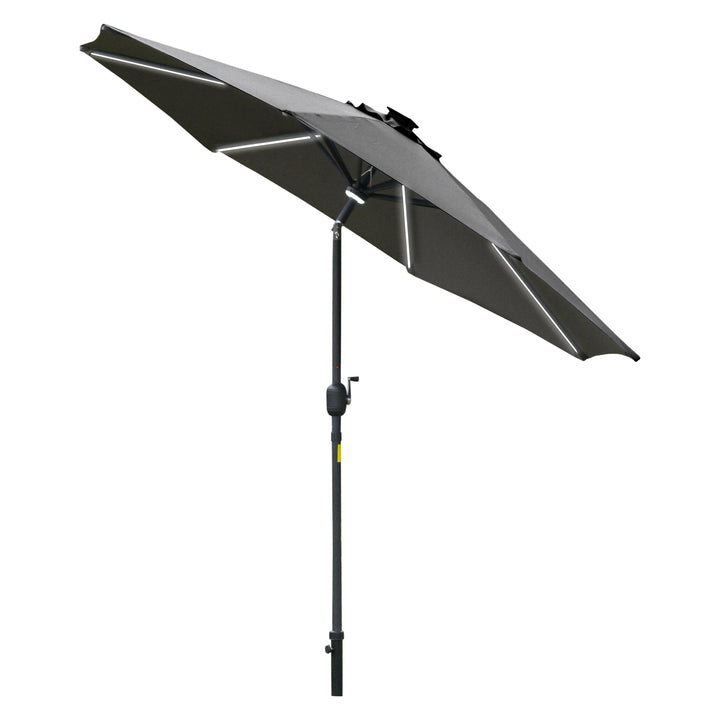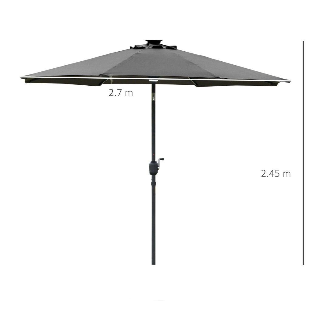 Keep yourself protected whilst enjoying the sun all day long with this sun umbrella from Outsunny. The polyester canopy provides protection from direct sunlight and heat. Using a crank mechanism for effortless opening and closing, the umbrella pole can be easily tilted to maximize your shade. Powered by panel solar, the LED lights on the ribs can provide you more lights at night. The perfect blend of beauty and function.