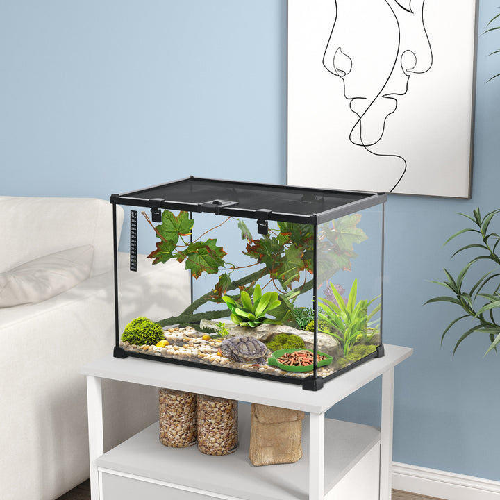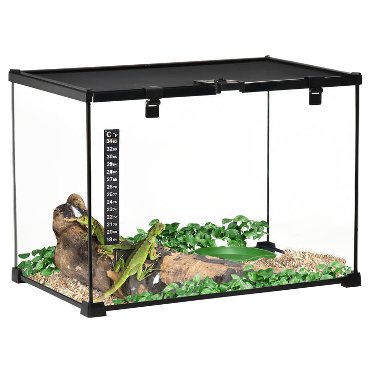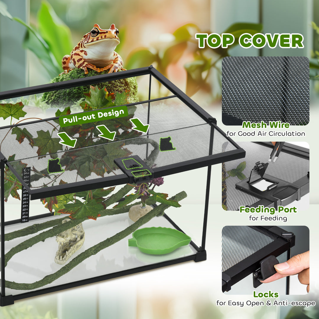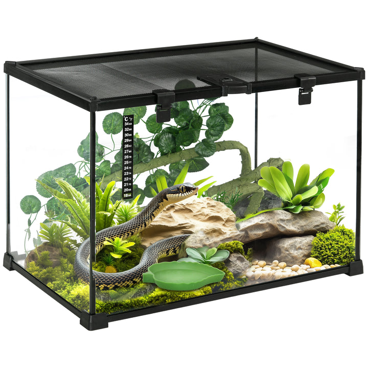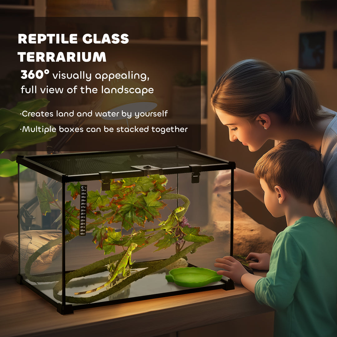 Do you want to give your pets a realistic wild heaven? Our Pawhut reptile box is your best choice. You can create land and water, rainforest habitat by yourself. Includes with a leaf-shaped water basin and a strip patch thermometer, it is an ideal habitat for reptile animals. The pull-out top cover includes a feeding port for easy feeding. Offering the best viewing for you and your animal, a popular micro landscape in a small-scale reptile terrarium, are hygienic and easy to clean.