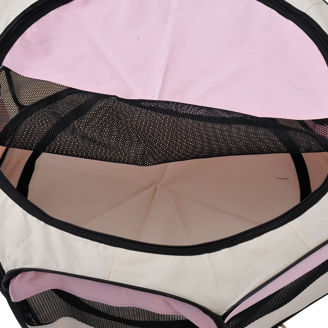 This stylish pet playpen in octagon shape is a great solution for cat, dog and other small animals. They can be kept safe in countless circumstance, perfect for travel. 8 panels with breathable mesh are beneficial for air flow and visibility. Mesh cloth top cover fixed with zipper for safety and shade, 2 roll up and zipped doors for easy access. Pets will play and take exercise in it safely and comfortably. Lightweight and portable, also includes one carrying bag for easy transport and quick storage when not in use.