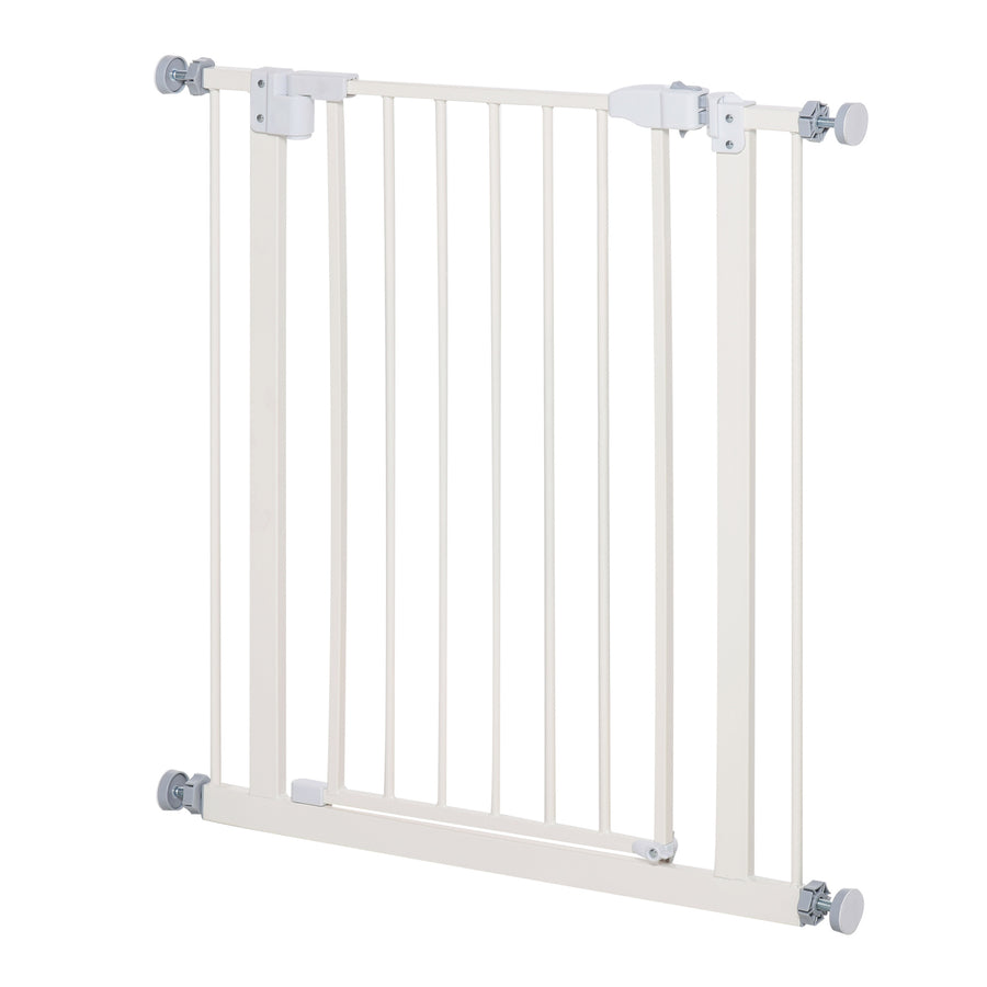 Keep pets away from specific places easily with this puppy gate from PawHut. It's made from metal for strength, and its width can be adjusted between 74cm and 80cm, meaning it will fit properly in door frames and other passages. Fitted with a middle door to pass when needed, the slide-and-lift handle is easy to use so you can walk through quickly. Two rotating locks on the bottom allow the door to opened both ways, with a double locking mechanism to finish for extra safety.