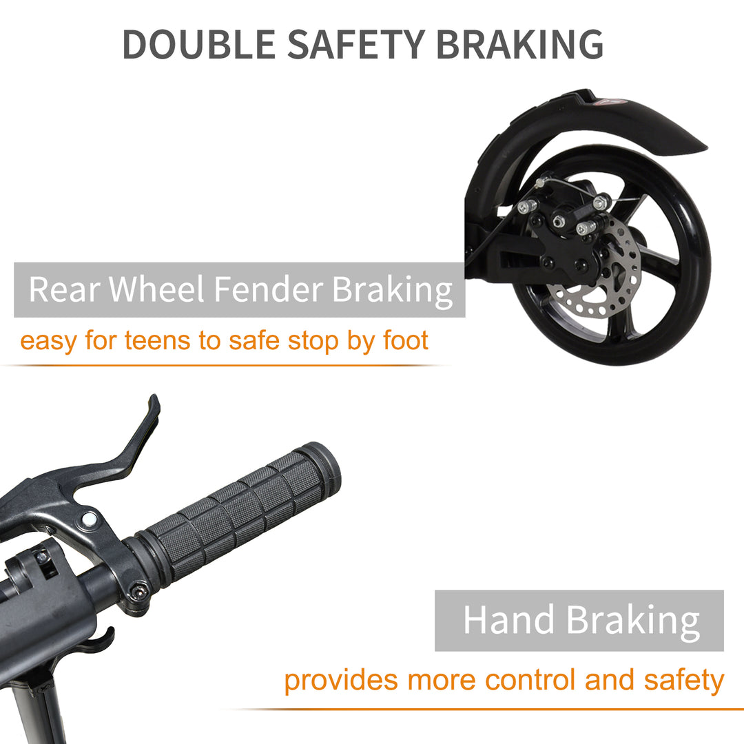 Upgrade your kick scooter in style from HOMCOM. Using aluminium to ensure a frame which is just as durable and reliable as it is lightweight, the scooter is made with a wealth of impressive features for the ultimate ride: a three-level adjustable handlebar, a wide foot board, comfortable grip handles with a front and back brake – giving you two ways to stop whilst whizzing along. Safe as it is fun, two slip-resistant tyres pair with the shock mitigation system for a smooth and comfortable journey every time. A quick-fold design which allows it to be picked up and carried around easily. For children aged 14 years and above.