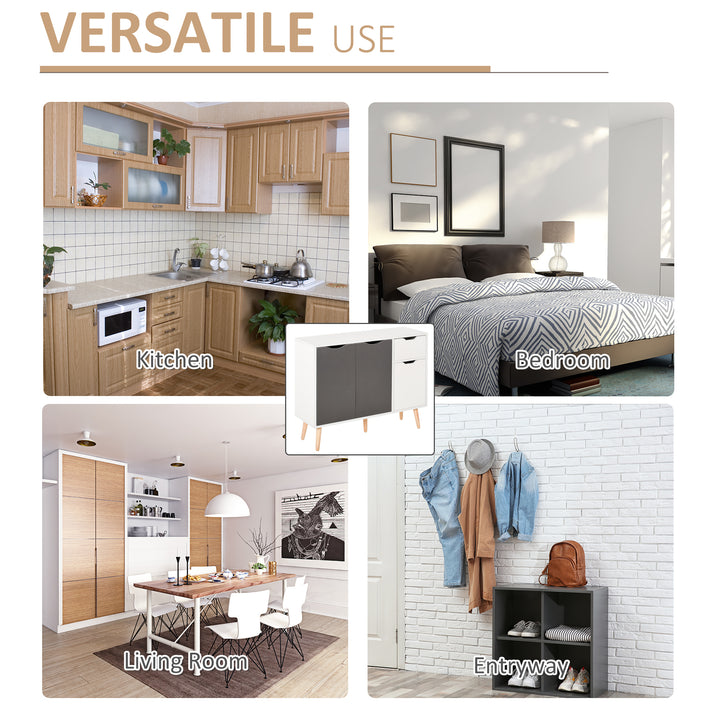 Keep your home stylish and the space tidy: look no further than this freestanding cabinet from HOMCOM. Cut to a clean boxy shape for simplicity, it comes with two large cupboards, one smaller cupboard and a top drawer, giving an abundance of handy storage. The white frame is clean, with the mix of white doors and coloured doors adding a unique point of difference so it stands out. Made from particle board, this piece is durable, finished with five wooden legs so it stands steady and back straps so it doesn't topple over.