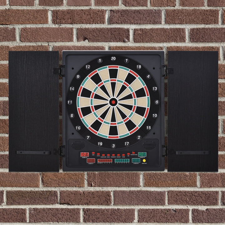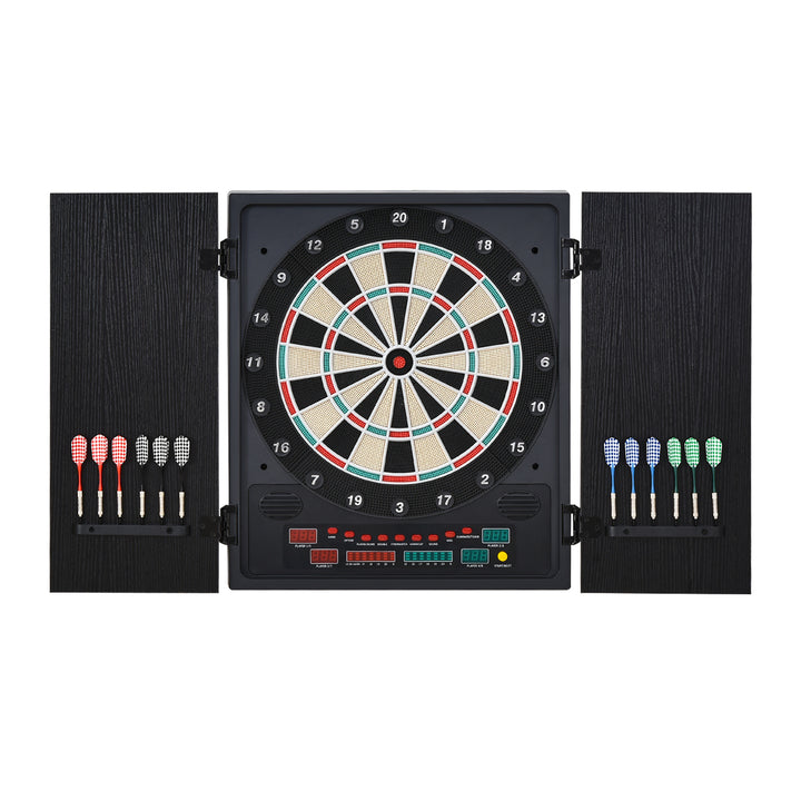 Bring classic game fun to the home with this LED dartboard from HOMCOM. A luxe design which features a dartboard in a two door casing to protect the board when not in use. The inside of the doors hold the darts for safe keeping. A large catchment area allows any missed-spot darts to collect and avoid damaging any other areas. The LED panel on the bottom keeps track of the score so you don't lose track, with 27 games and 202 different scoring options. Volume is adjustable.