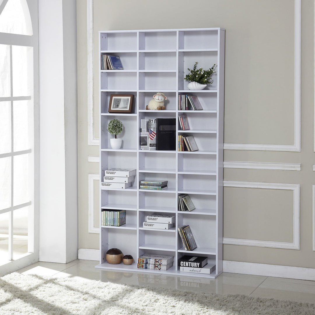 This HOMCOM media storage shelf is perfect for organizing your CDS, DVDS, books etc. Partition boards could be installed at adjustable height to meet different storage needs. This will be a modern and practical furniture in any room. You can be assured that your books, media products will stay safe while they sit in the shelf due to its sturdy base.