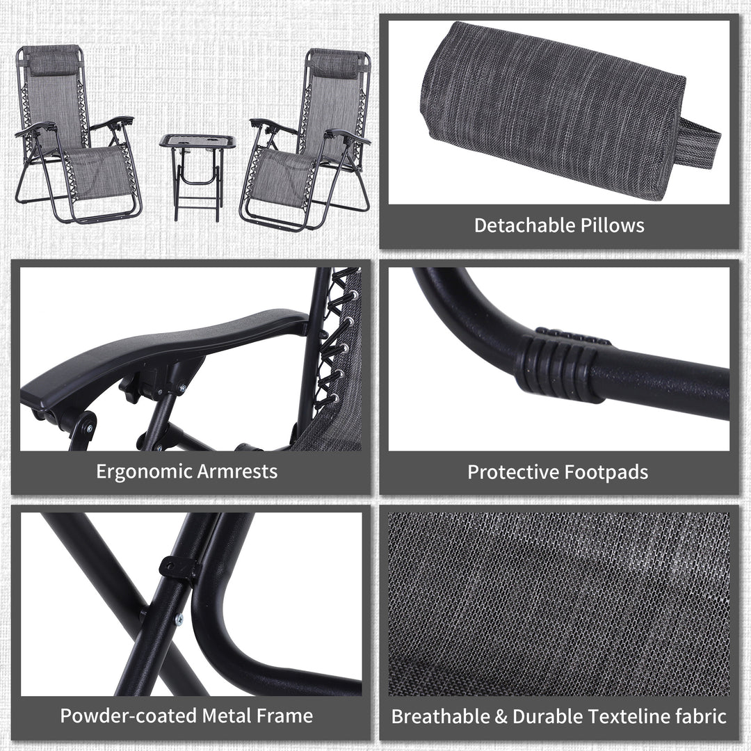 Lounging with a friend has never been so relaxing, thanks to the garden recliner chairs set of 3 from Outsunny. Formed of two reclining garden chairs and a matching table, you've got everything you need. Powder-coated steel frame for strength, with a cushioned headrest for comfort. The backs recline back to any position. Comes complete with a handy side table.