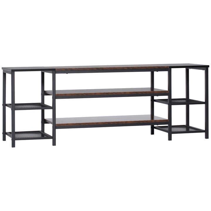 Upgrade your living room with this HOMCOM TV unit. It has six shelves and a large table-top: room for holding a TV and all the watching essentials you need. The open shelves of the TV stand are suitable for fitting plenty of differently-sized appliances. The black metal frame means a strong structure, whilst the wood-effect shelves create a striking look for industrial style. A must-have companion for every relaxing moment.